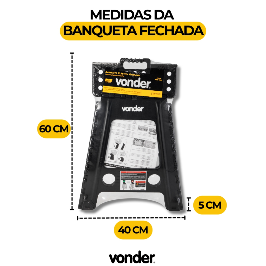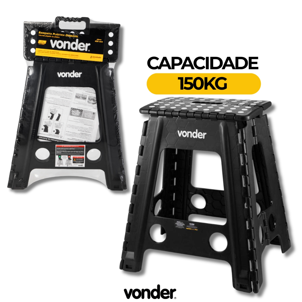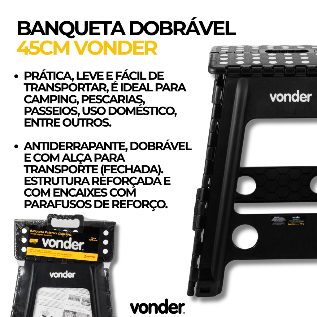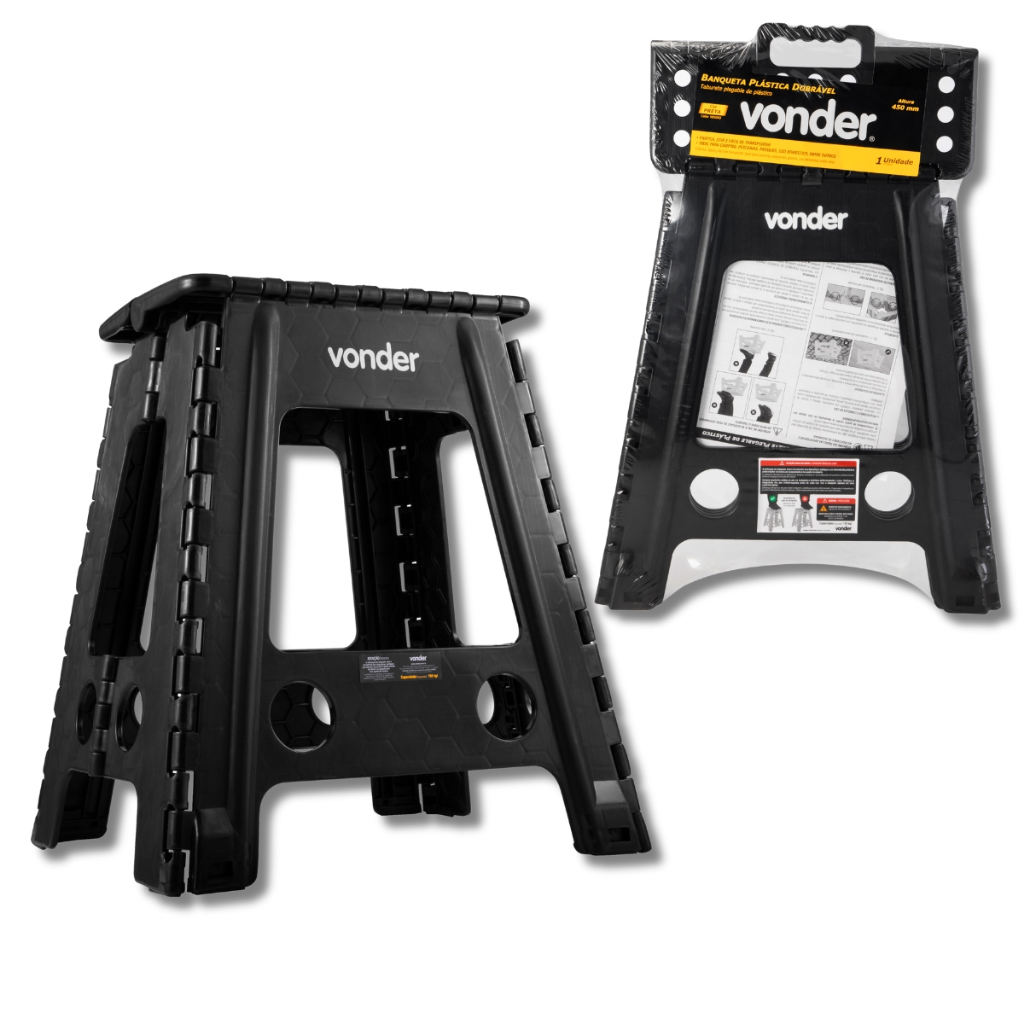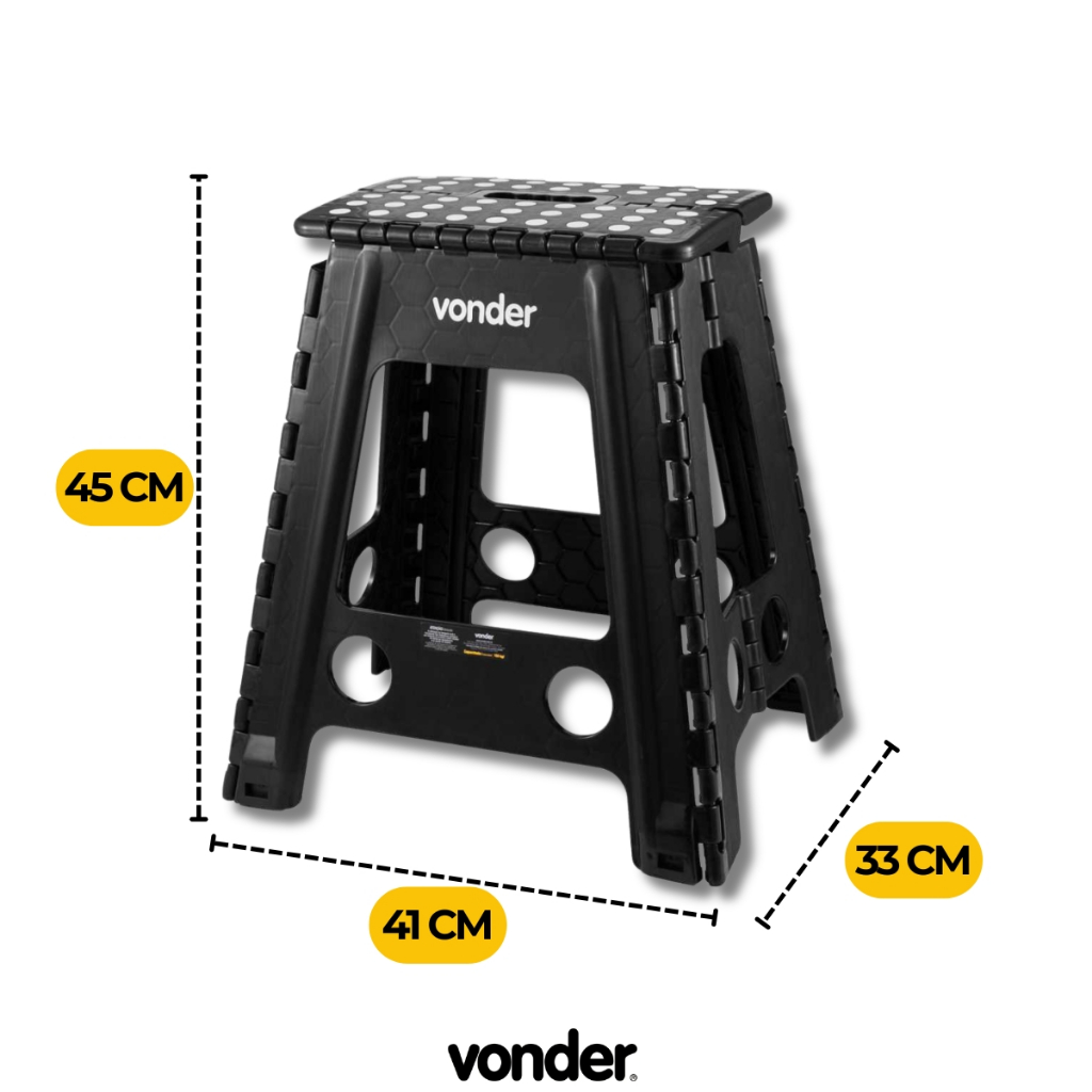 Banqueta Banquinho de Plástico ABS Dobrável 45cm Anti Derrapante Resistente até 150kg Preta Vonder