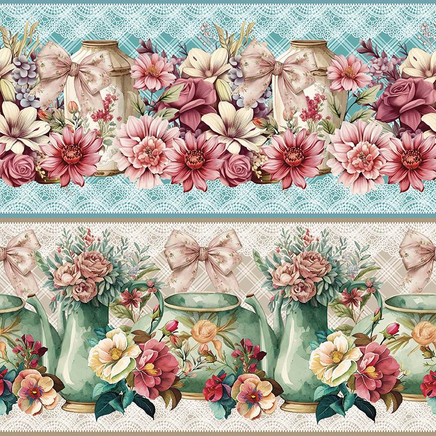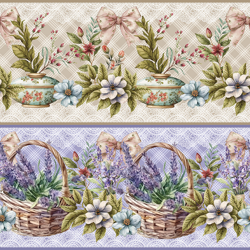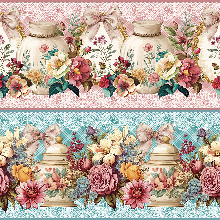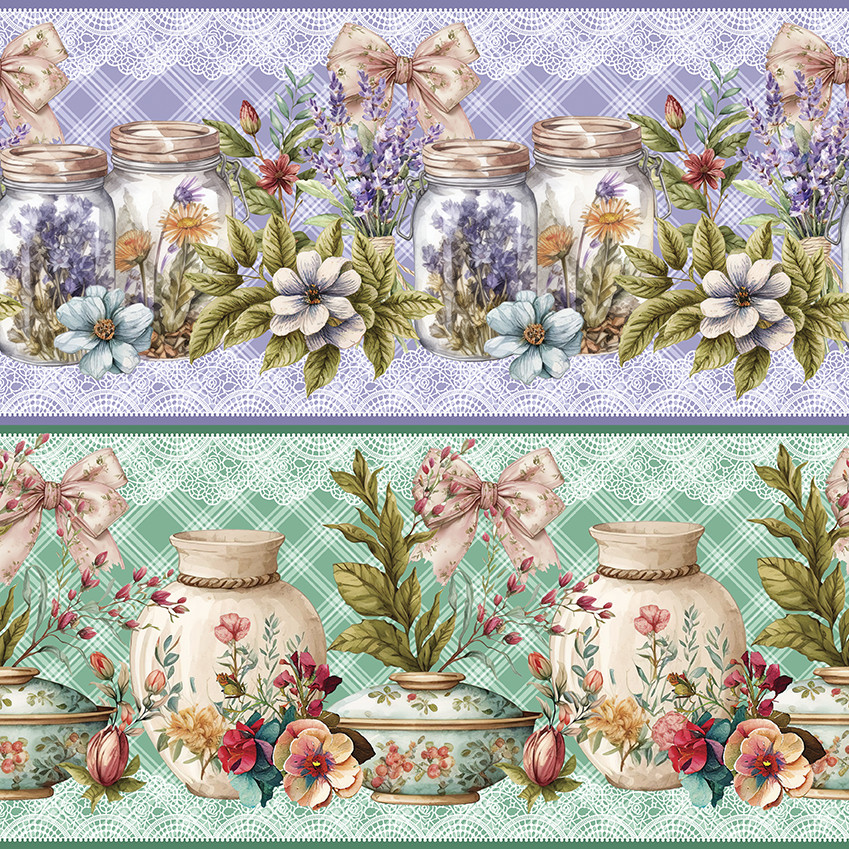 Tricoline Digital Barrado Potes Florais 100%Alg 55cm x 1,50m