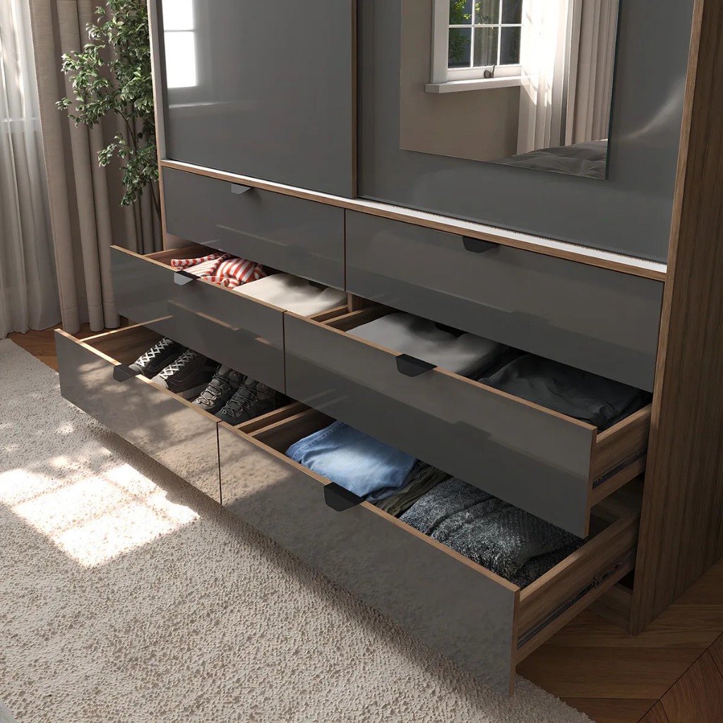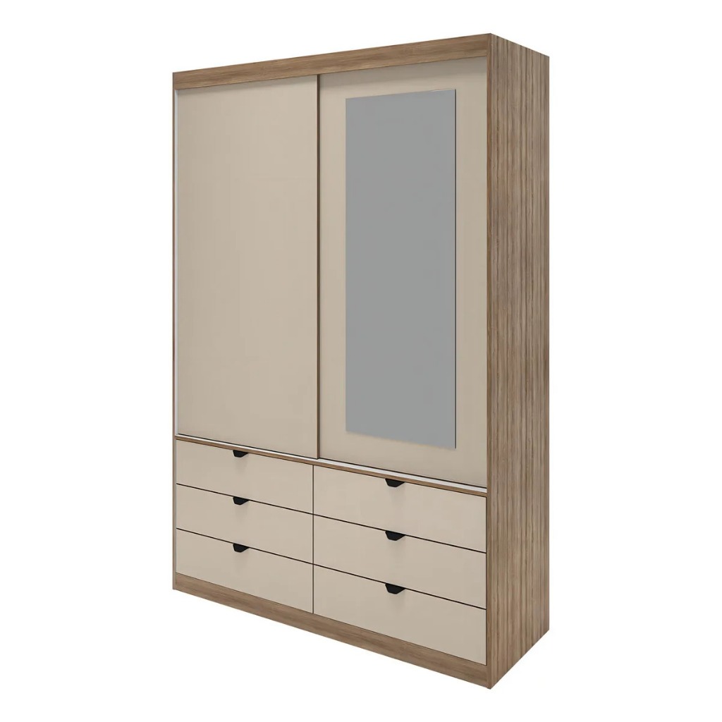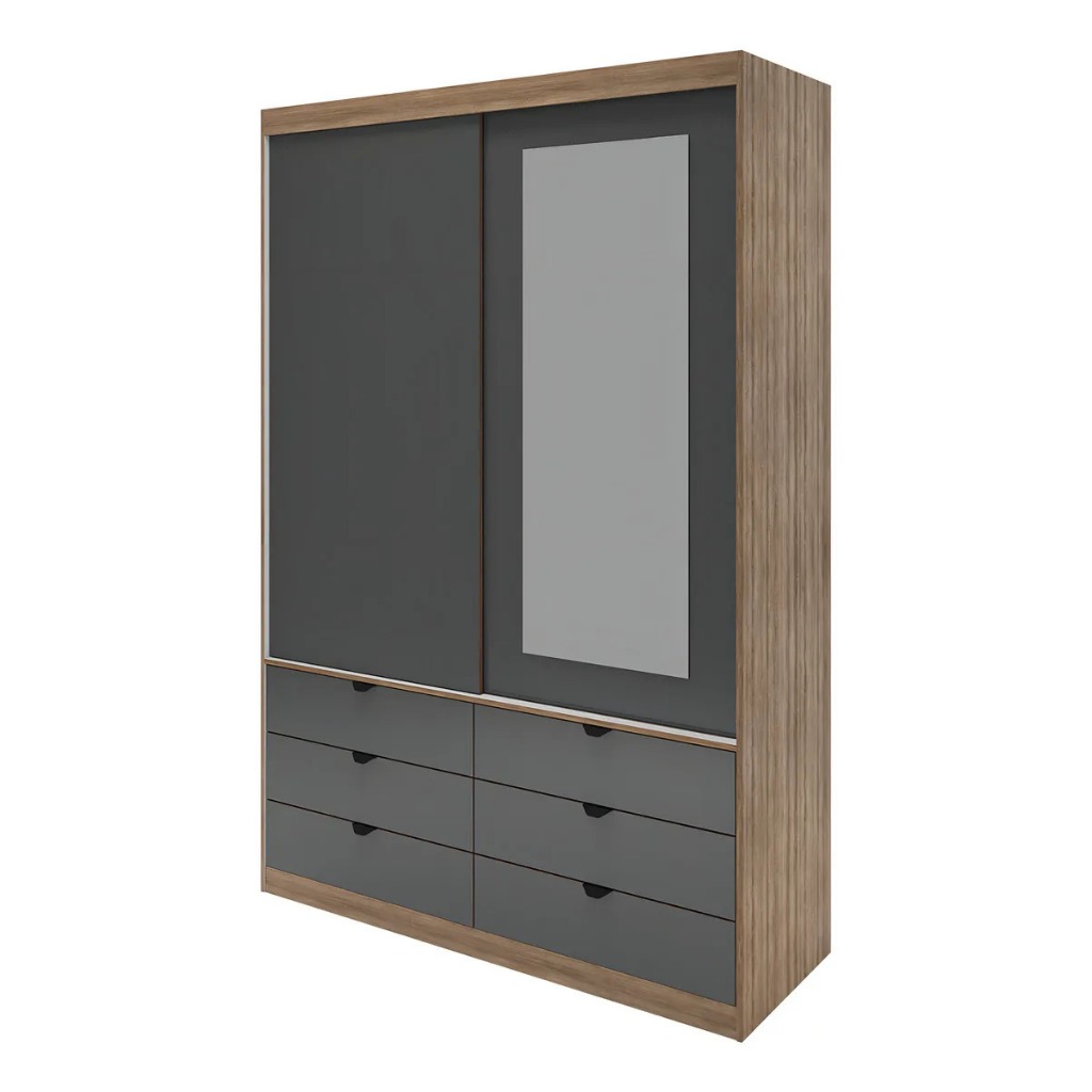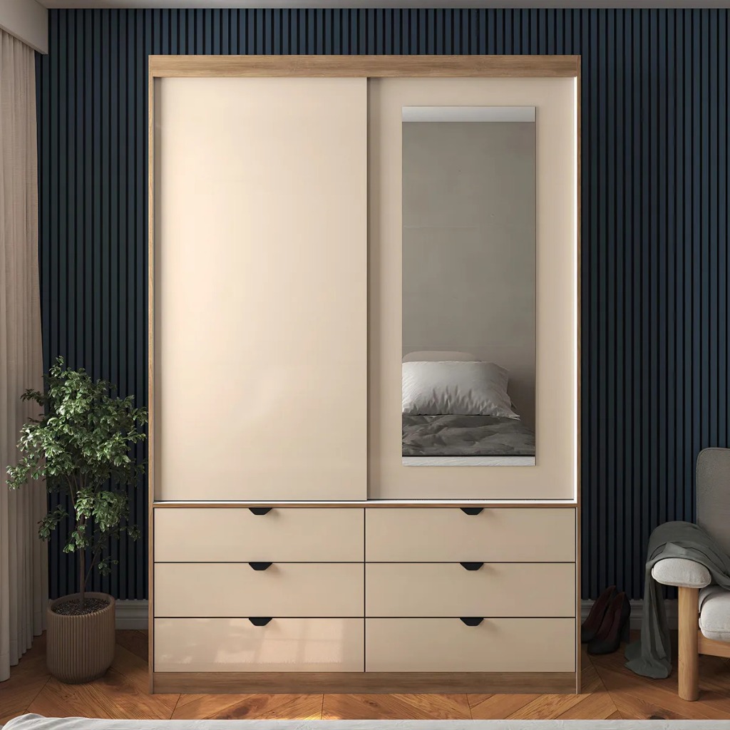 Guarda-Roupa de Solteiro Moderno com Espelho 2 Portas de Correr 6 Gavetas MDF