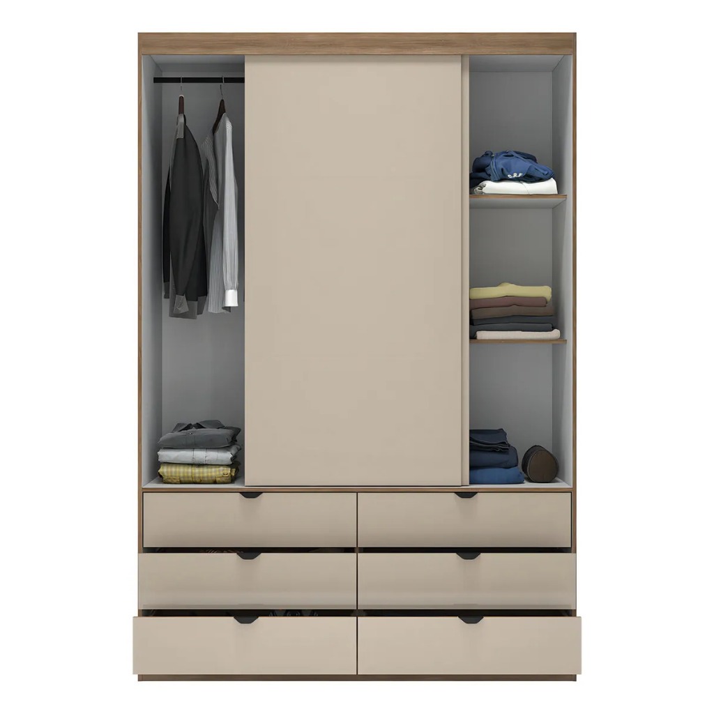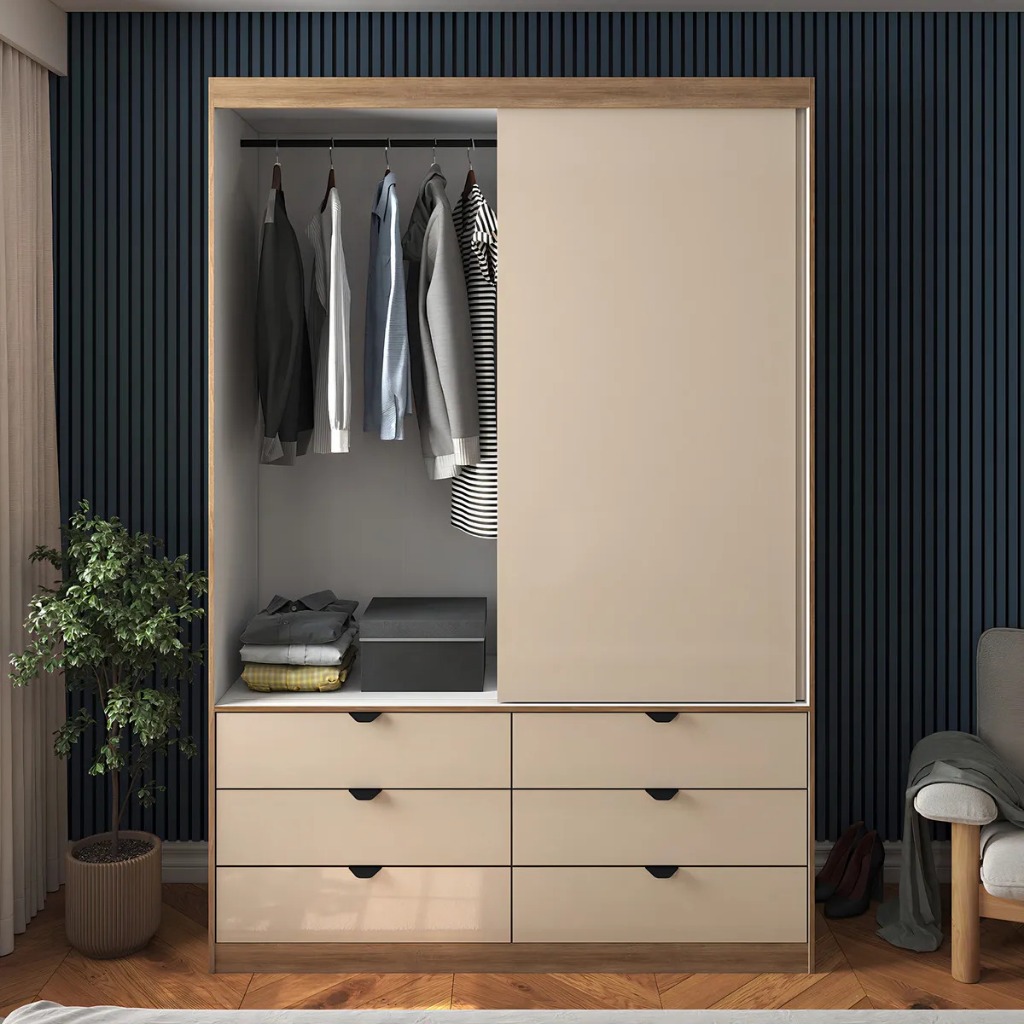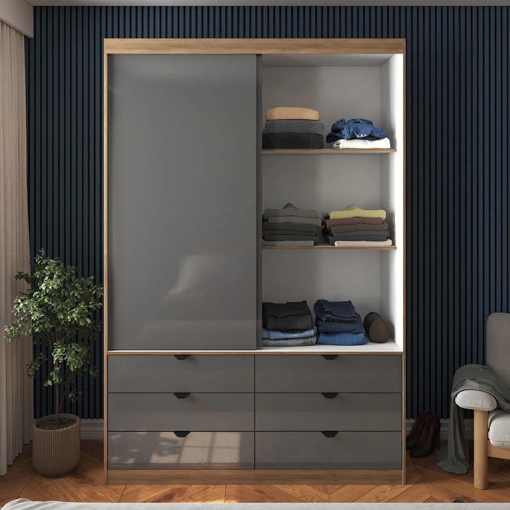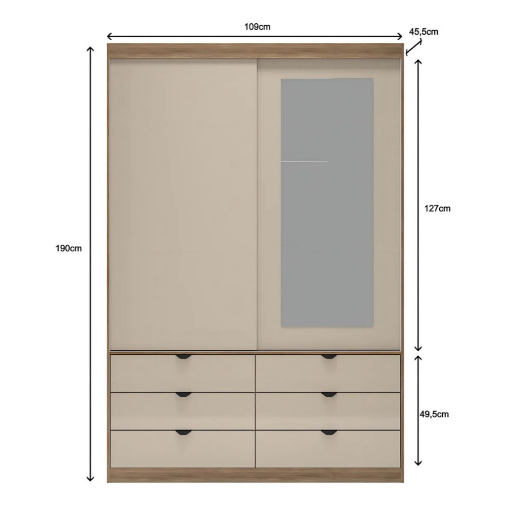 Guarda-Roupa de Solteiro Moderno com Espelho 2 Portas de Correr 6 Gavetas MDF