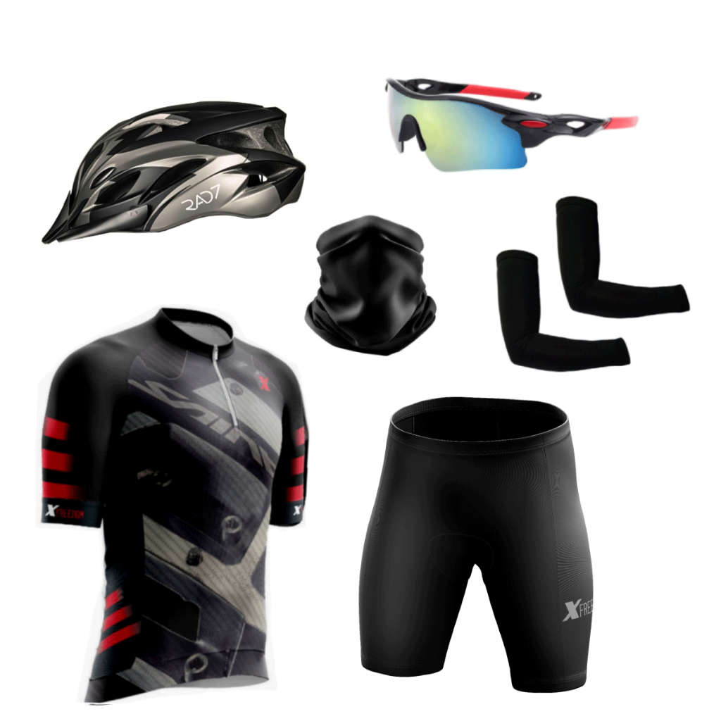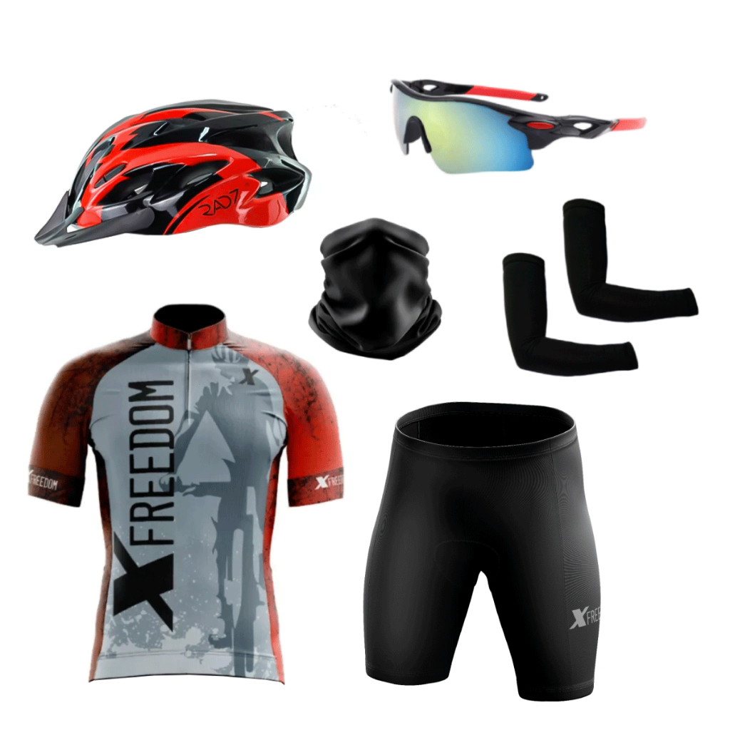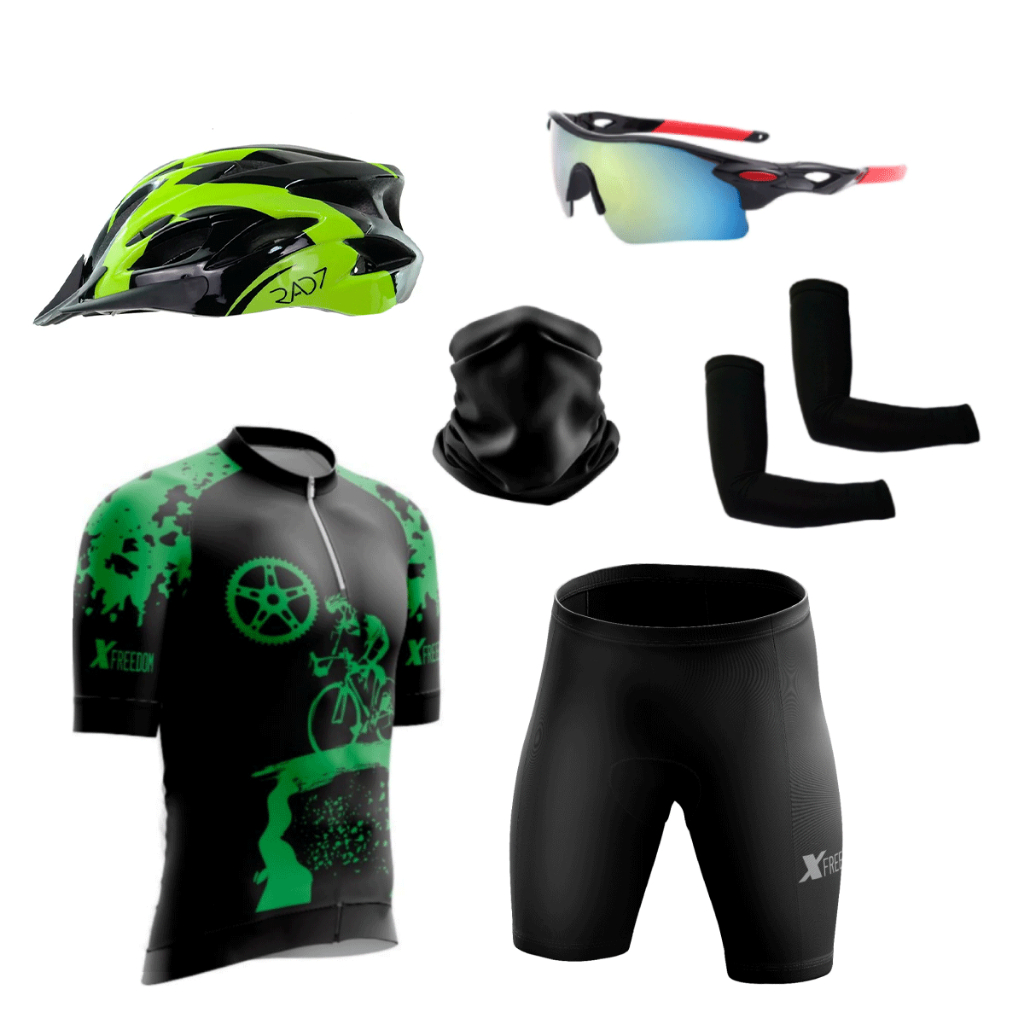 Kit Ciclismo Conjunto Camisa Bermuda + Capacete Ciclismo Led + Óculos de Proteção + Manguito+Bandana