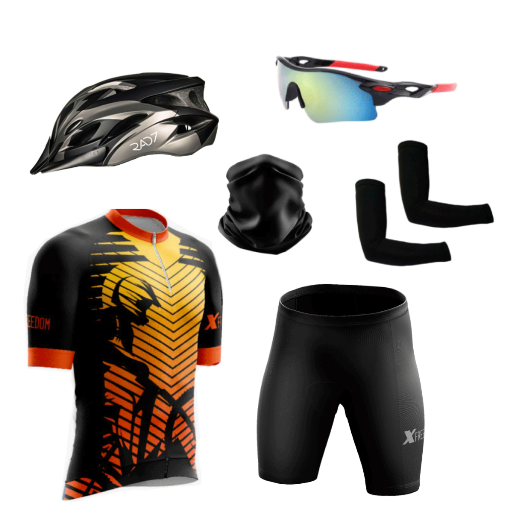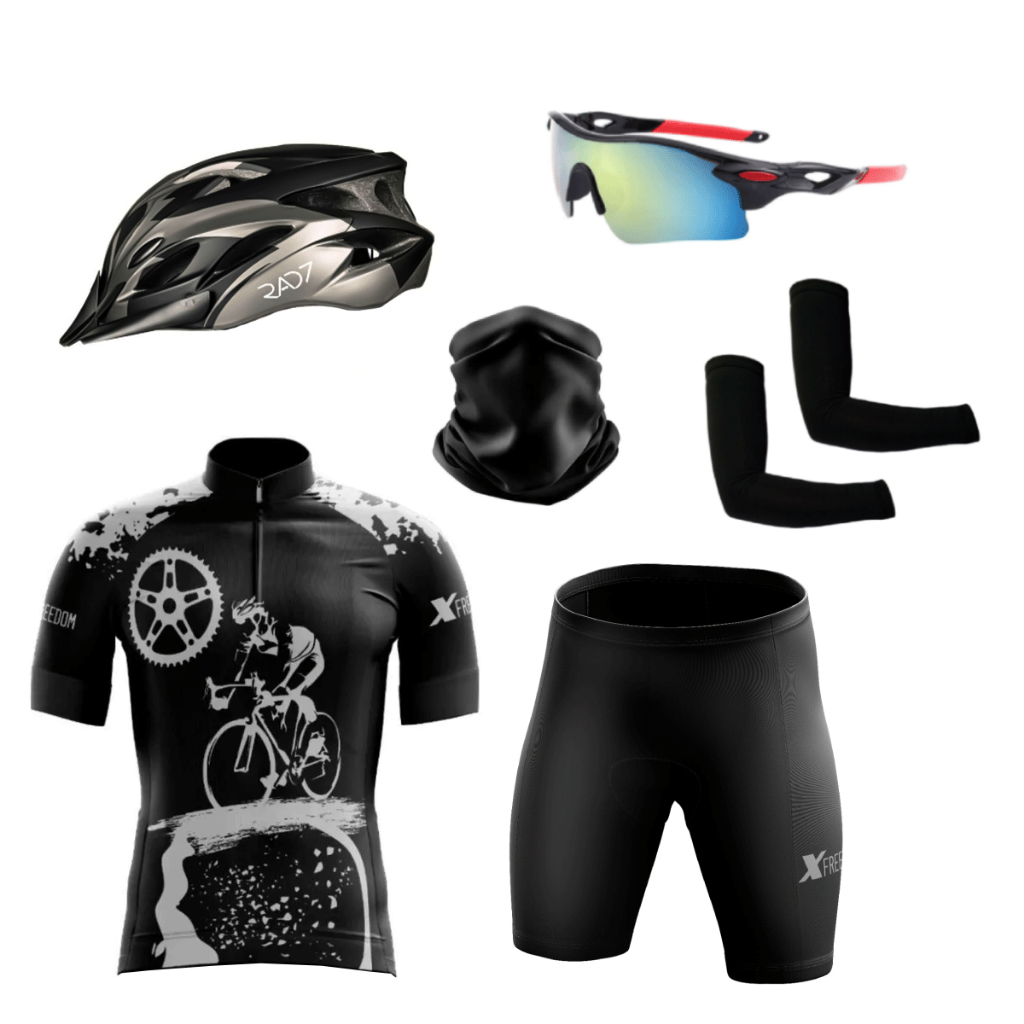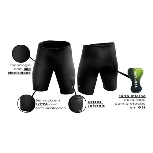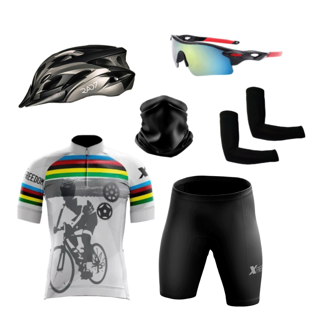 Kit Ciclismo Conjunto Camisa Bermuda + Capacete Ciclismo Led + Óculos de Proteção + Manguito+Bandana