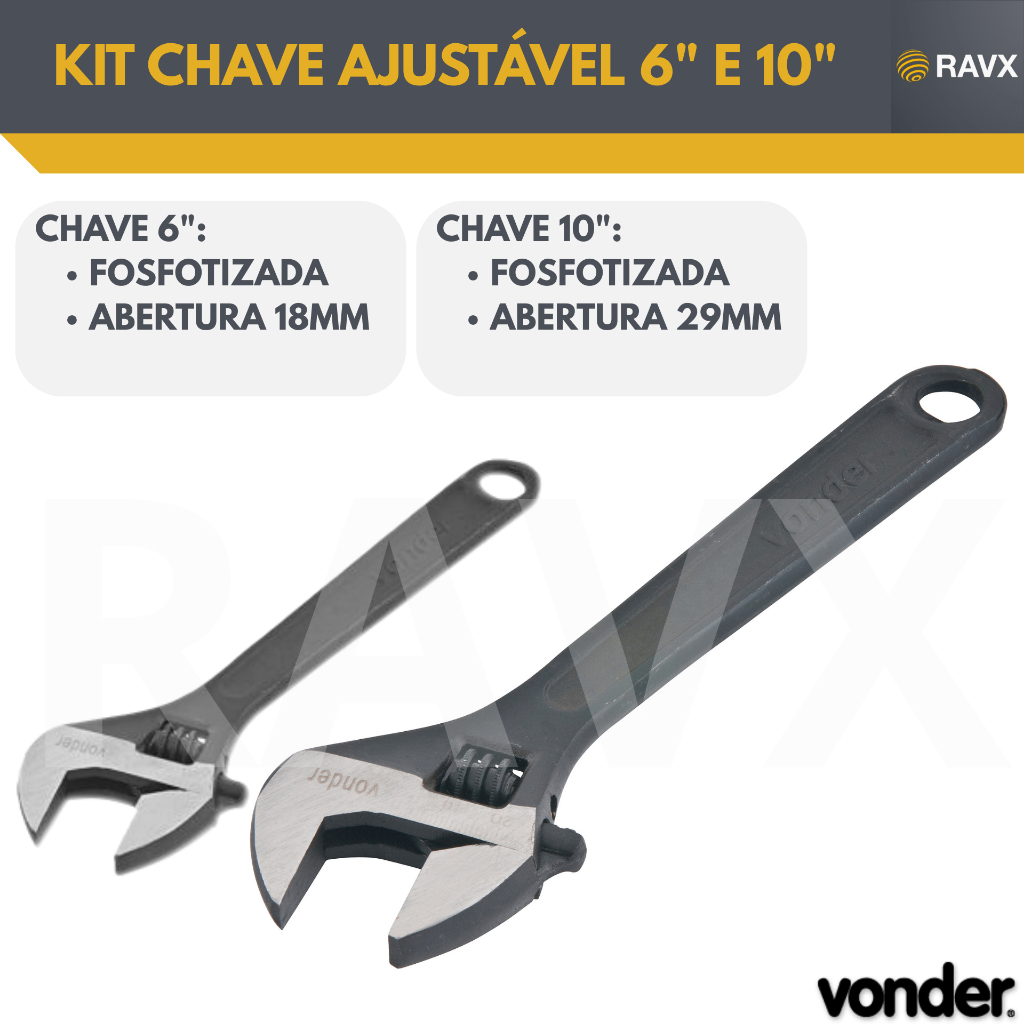 Kit Chave Inglesa Ajustável 6” + 10” Vonder – Fosfatizadas – Aço Carbono – Alta Resistência