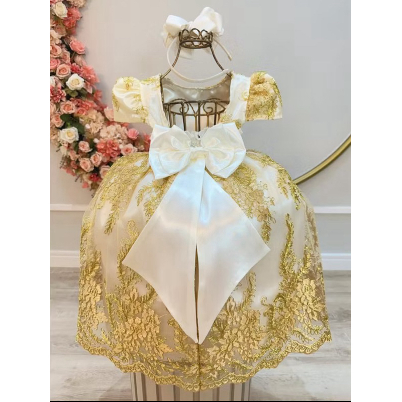 Vestido de Festa Infantil Batizado Aniversário Casamento Batizado Dourado Daminha Vestido Princesa Realeza Infantil Luxo
