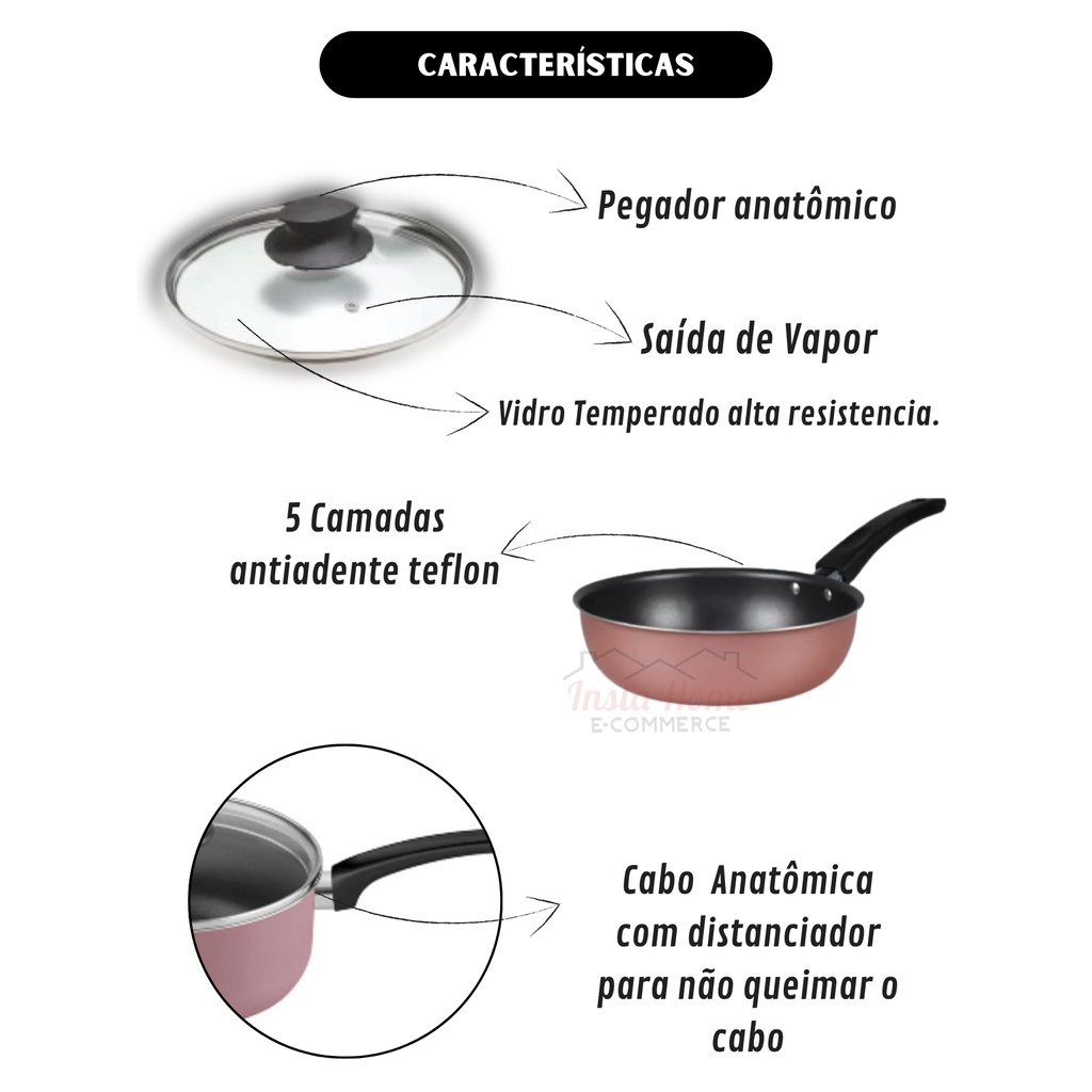 Conjunto kit Jogo de panelas Rose 18 peças Antiaderente Teflon Com Tampa de Vidro utensílios Cozinha