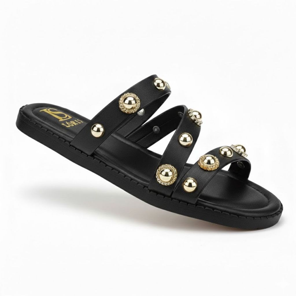 Rasteira Sandália com Rebite Dourado Tiras em Z Feminina Palmilha Luxo Rasteirinha 098