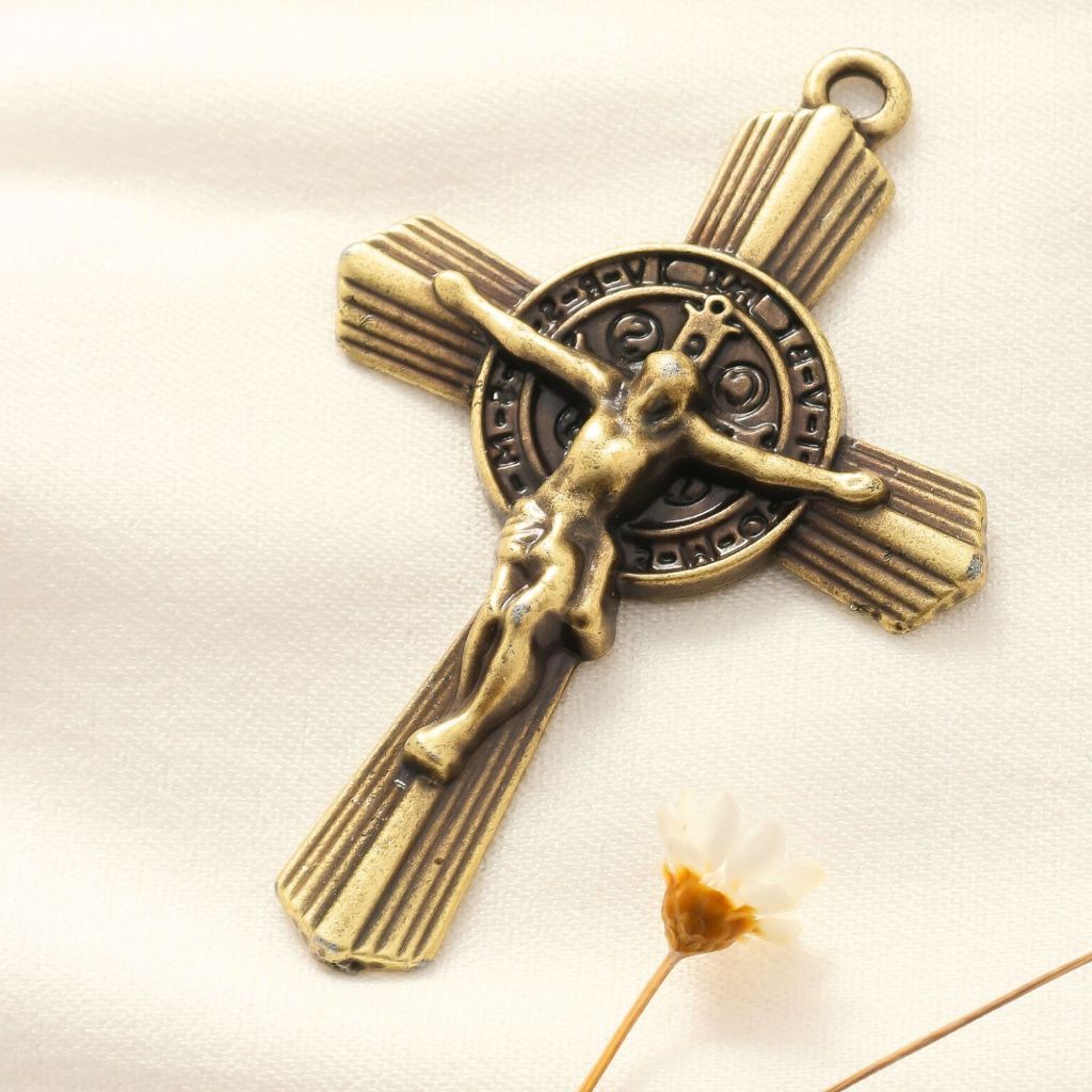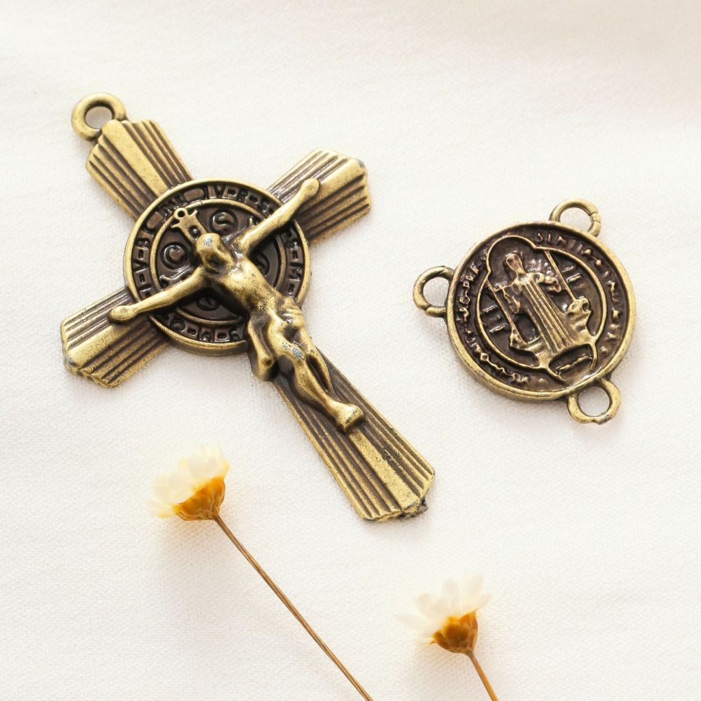 Entremeio Para Terço São Bento + Crucifixo 5x3,8 cm Ouro Velho Alta Qualidade Peças Para Terço