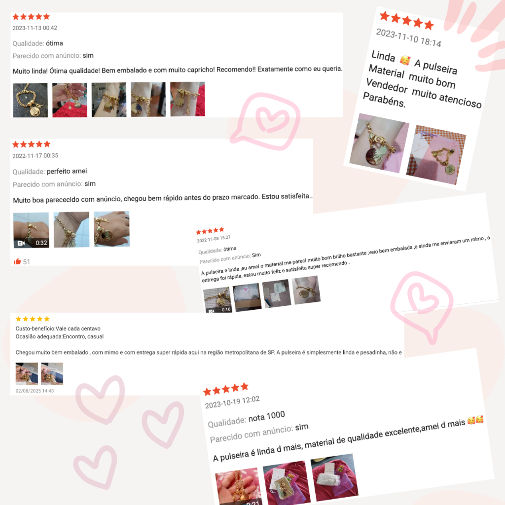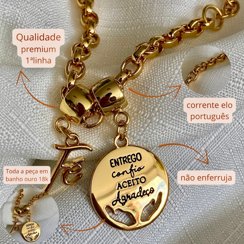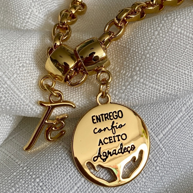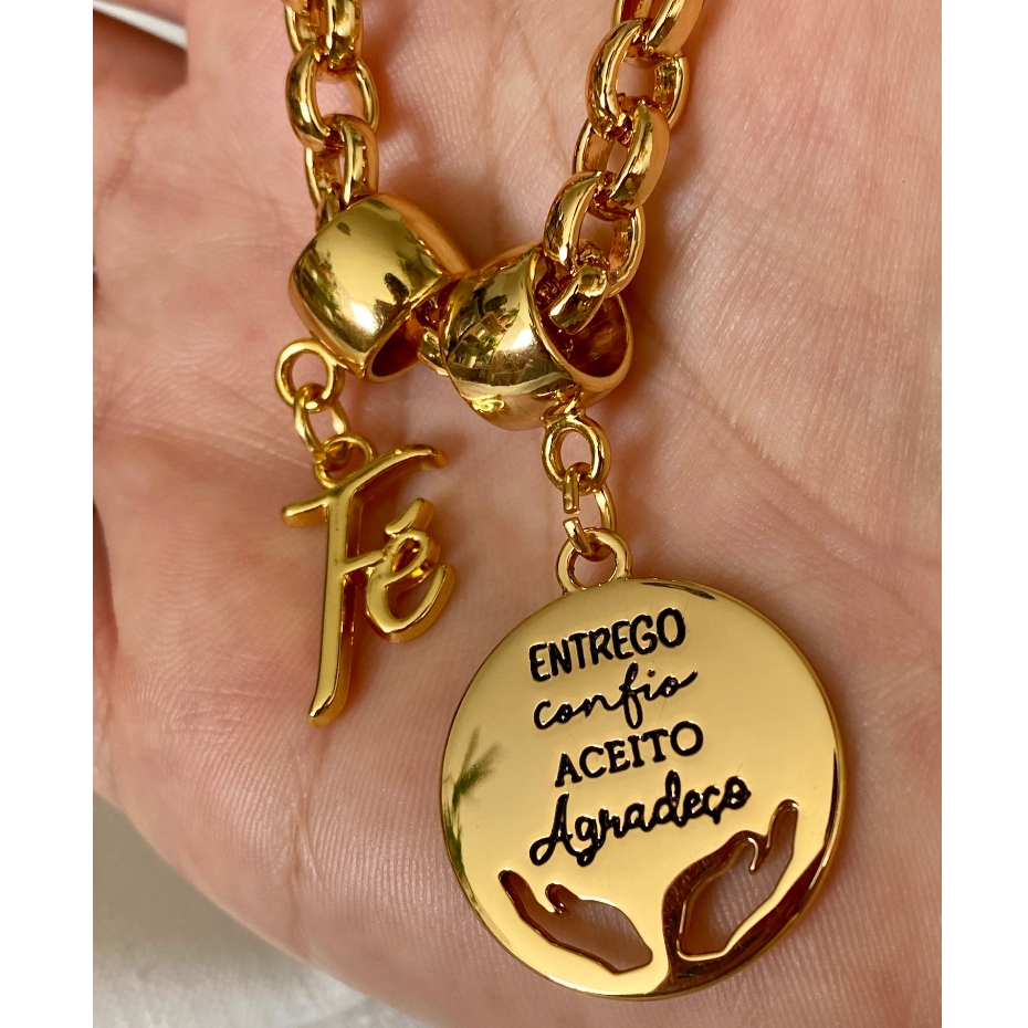 Pulseira Feminina em Corrente Elo Português com Pingentes Fé e Entrego Toda em Banho Ouro 18k