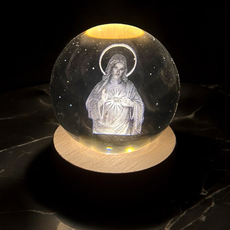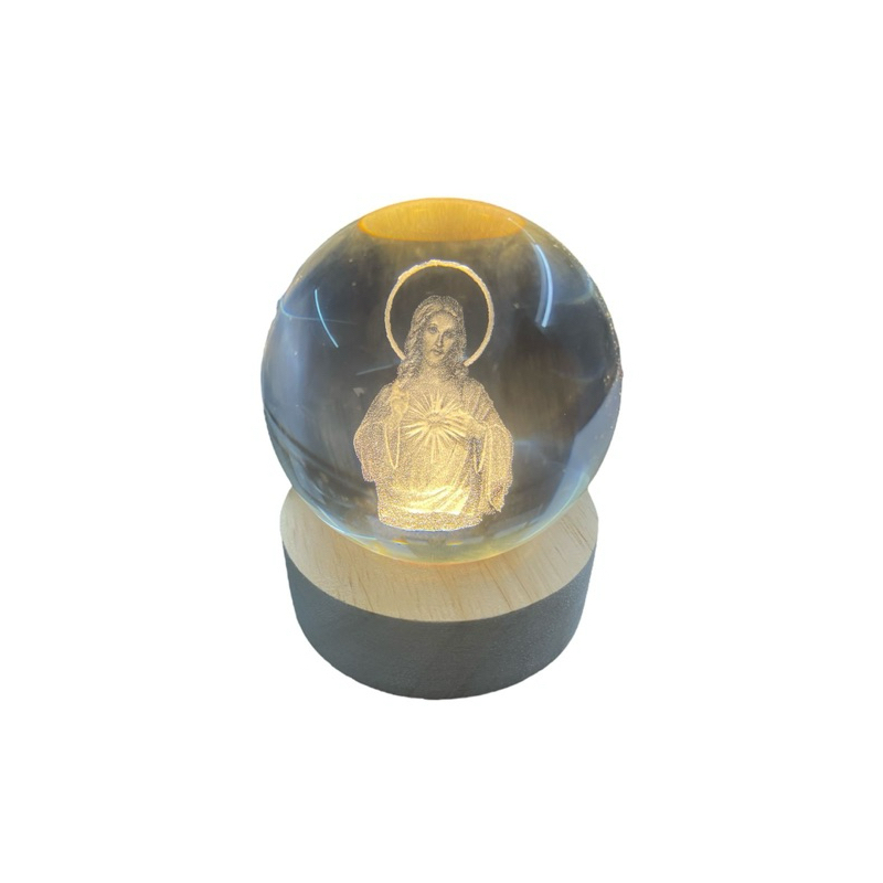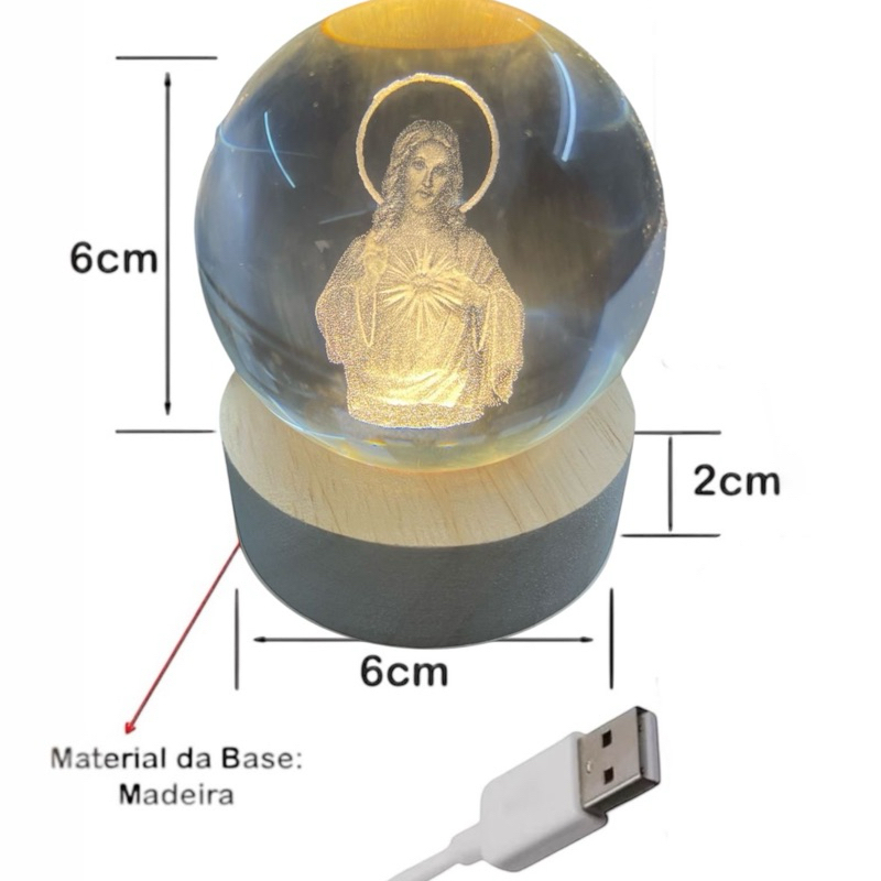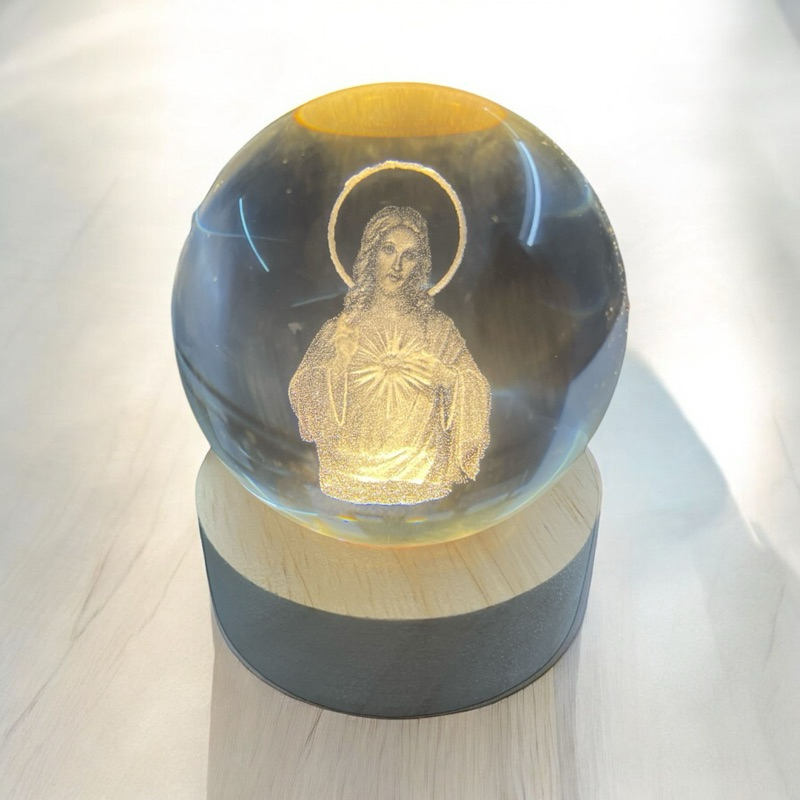 Luminária Abajur Mesa Bola de Cristal Sagrado Coração de Jesus Jesus 7 cm Luz LED 3d Decorativa Esfera Bivolt