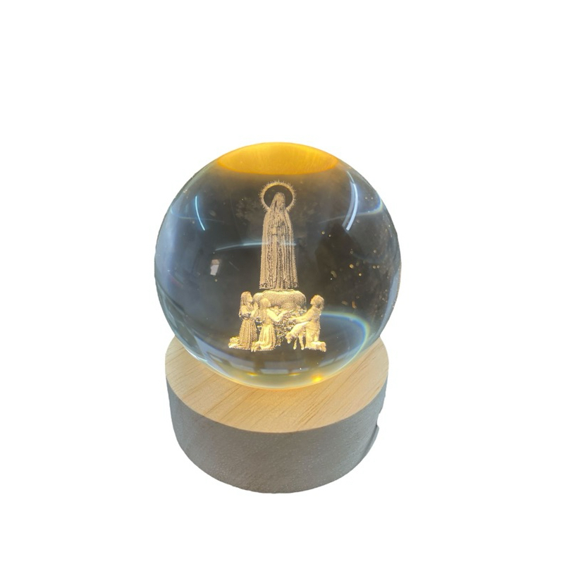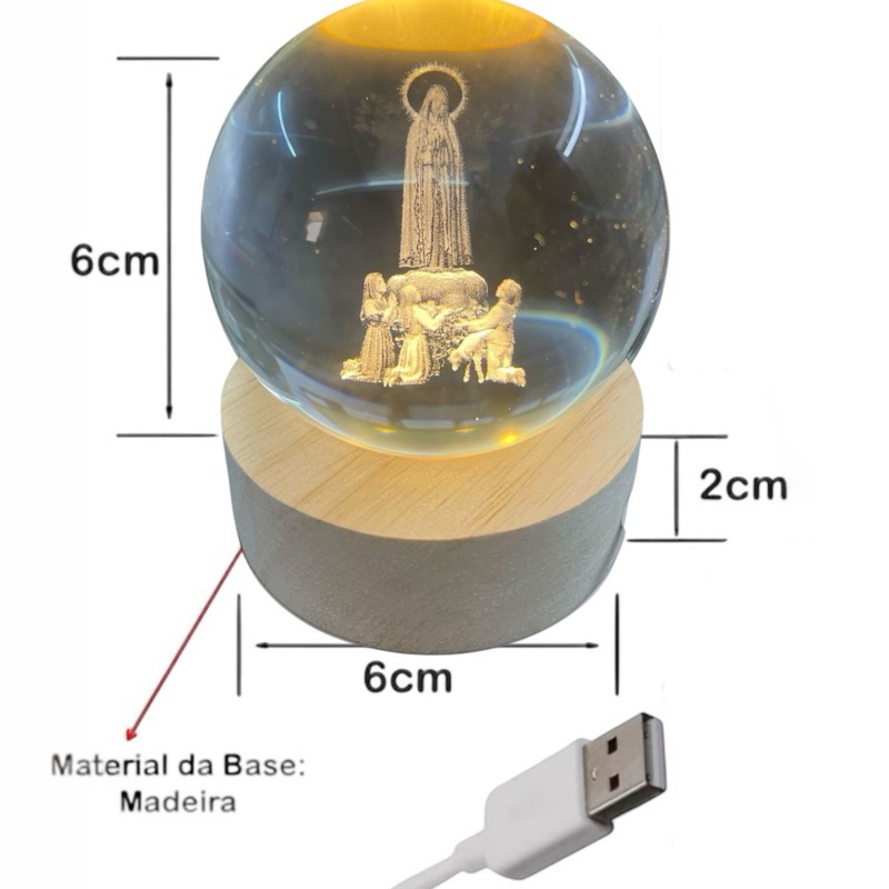 Luminária Abajur Mesa Bola de Cristal Nossa Senhora de Fátima 7 cm Luz LED 3d Decorativa Esfera Bivolt