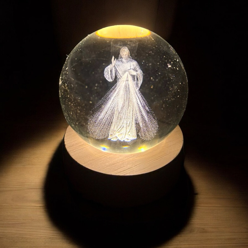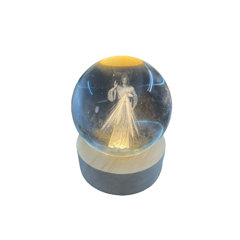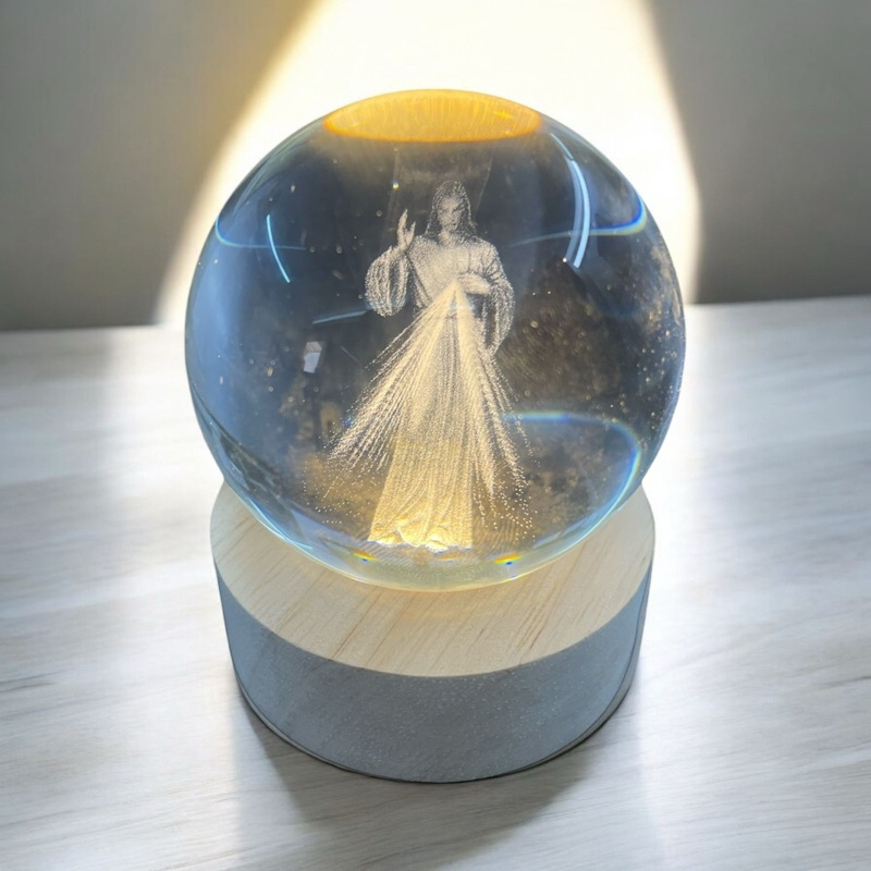 Luminária Abajur Mesa Bola de Cristal Jesus Misericordioso 7 cm Luz LED 3D Decorativa Esfera Bivolt Vidro