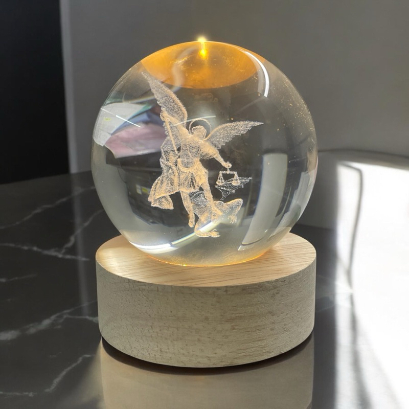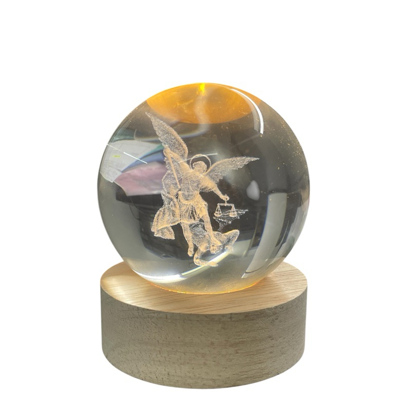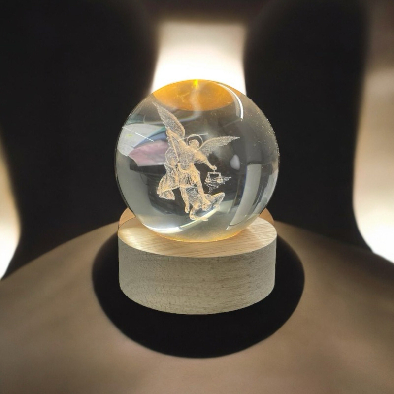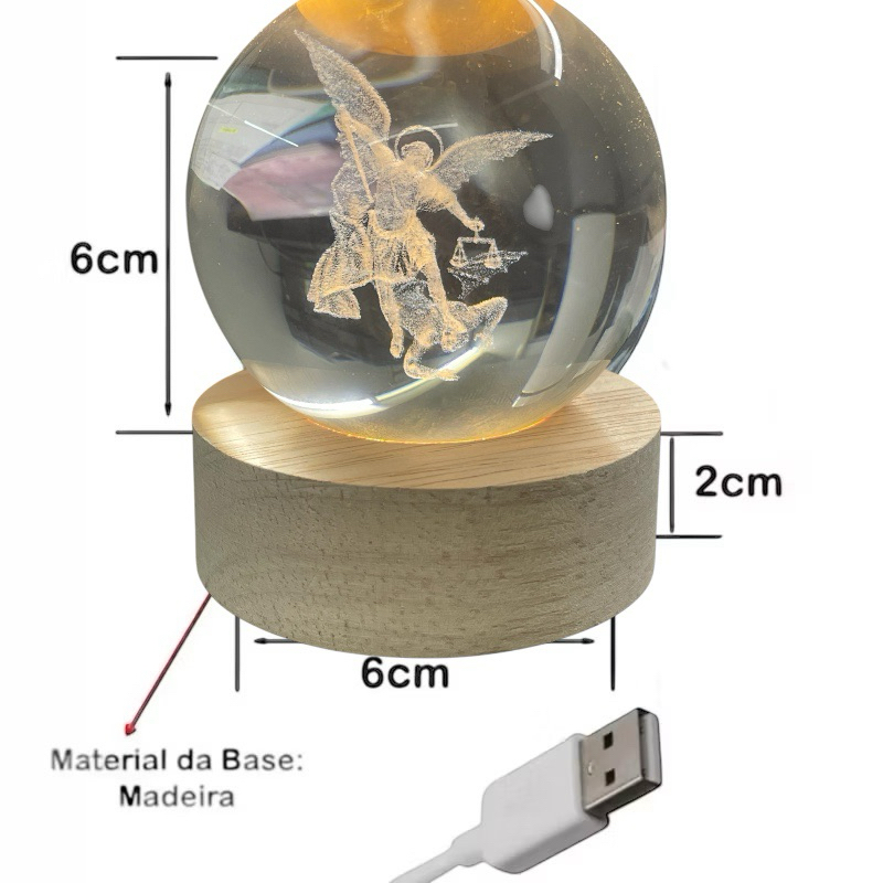Luminária Abajur Mesa Bola de Cristal São Miguel 7 cm Luz LED 3D Decorativa Esfera Bivolt Vidr