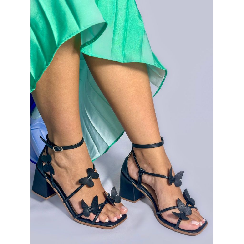 Sandália feminina salto alto grosso borboletas fivela tiras traseiro fechado conforto promoção (SALTO-VIRGINIA)