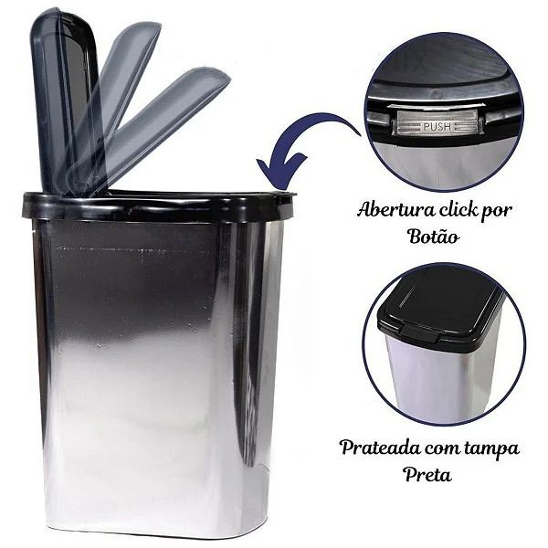 Kit 2 Lixeira Click Label de 9 Litros Plastico Cor Inox Retangular Cozinha Banheiro Tampa Click