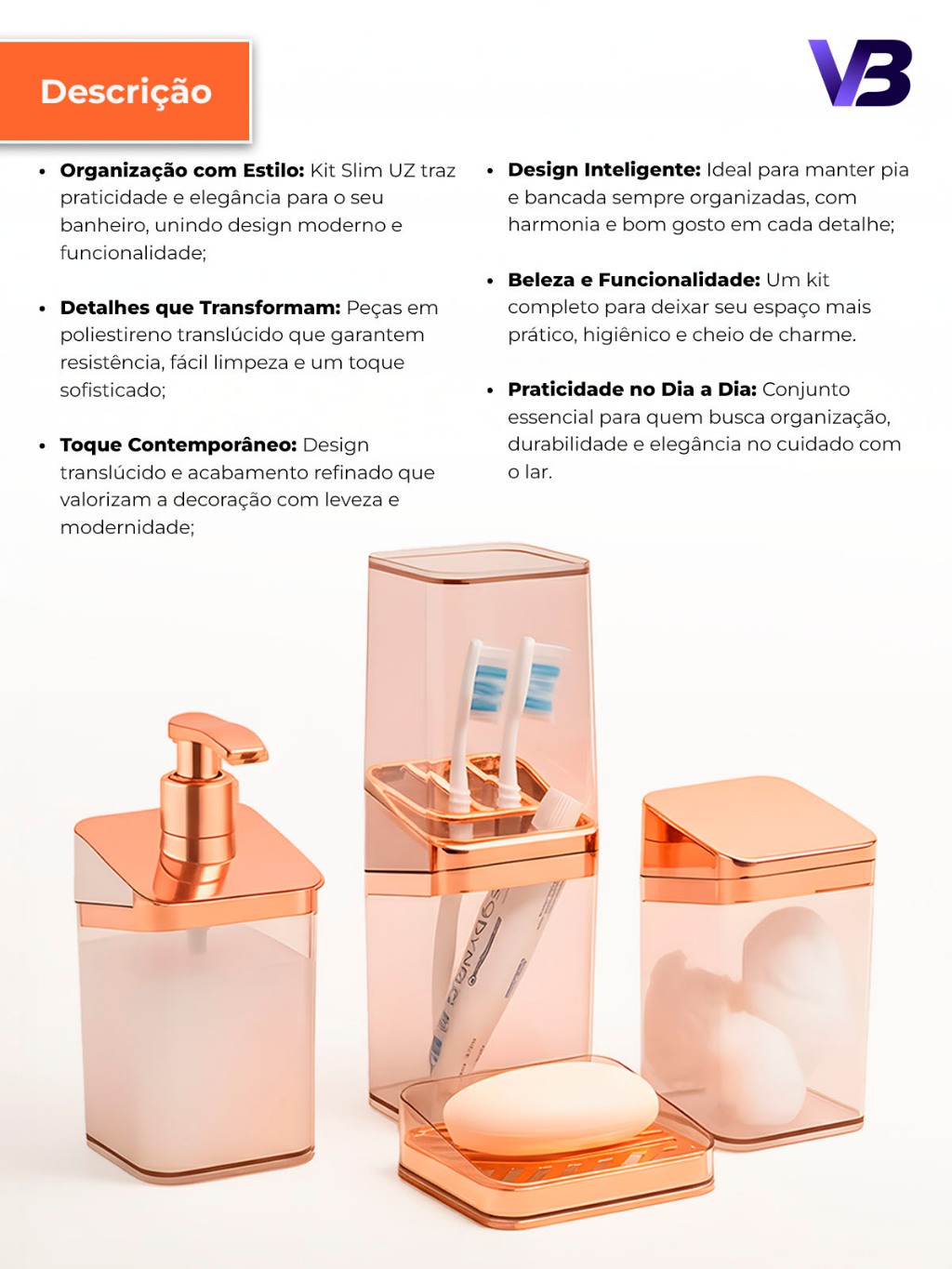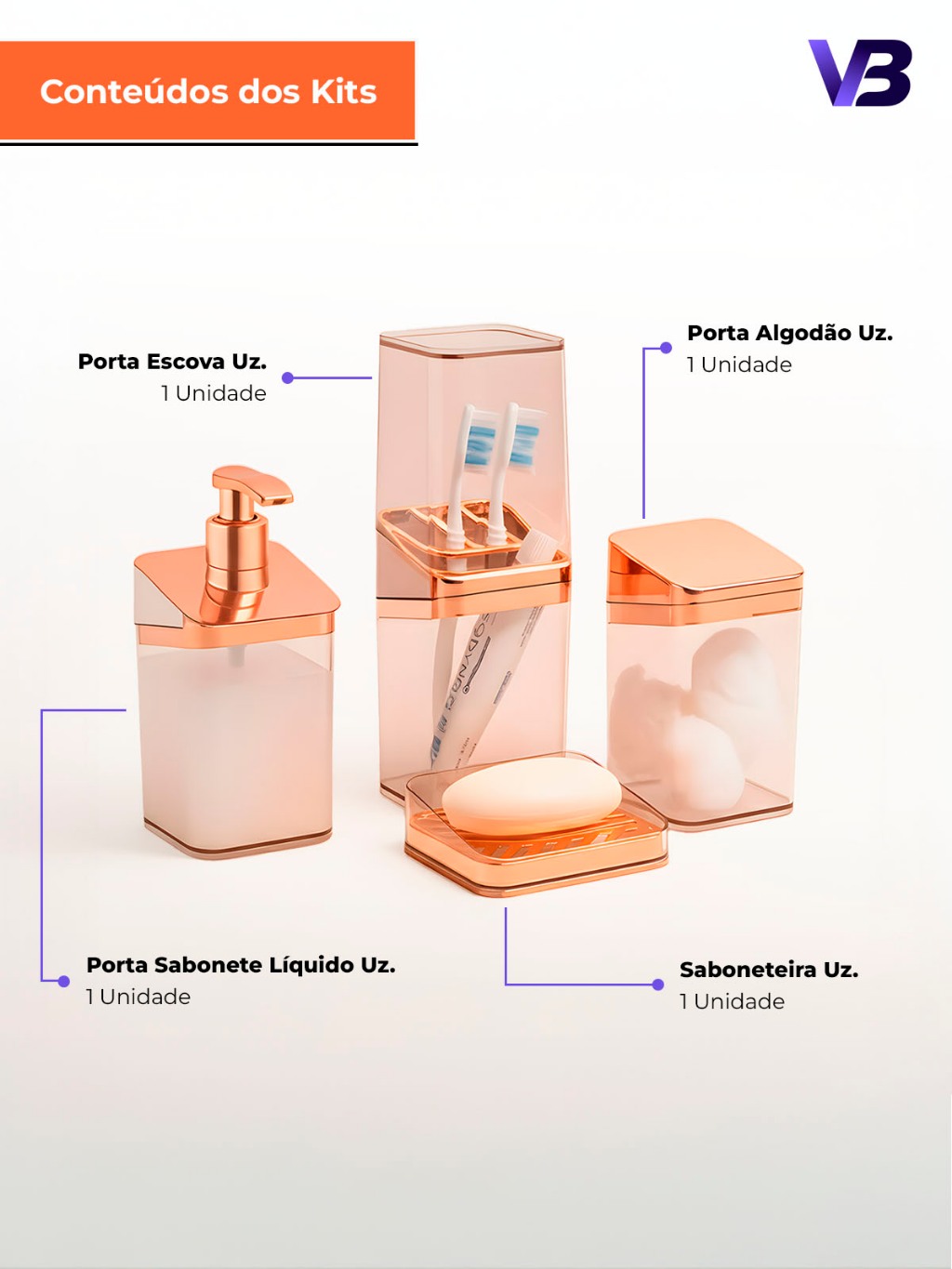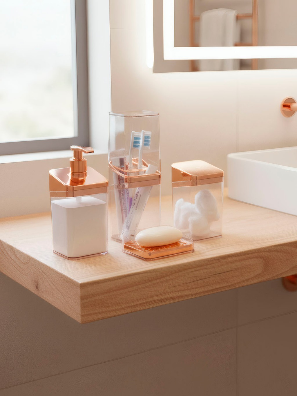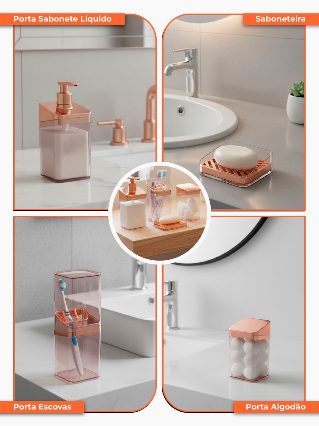 Kit Banheiro Luxo Lavabo Porta Sabonete Sabão Líquido Algodão Escova de Dentes Rose Gold