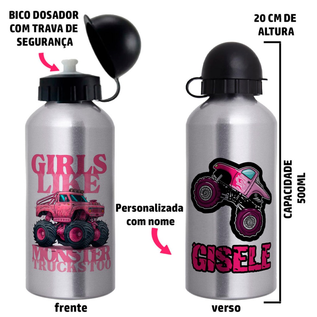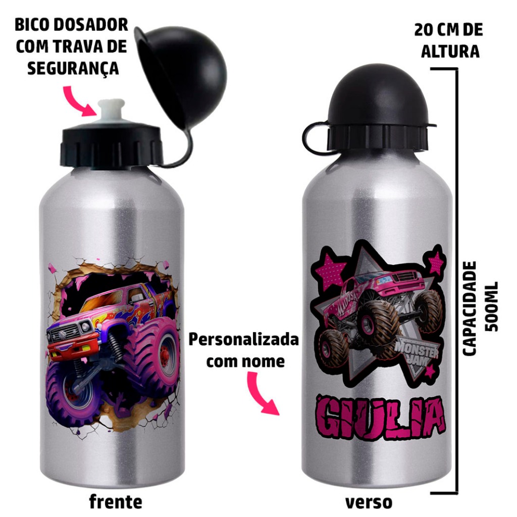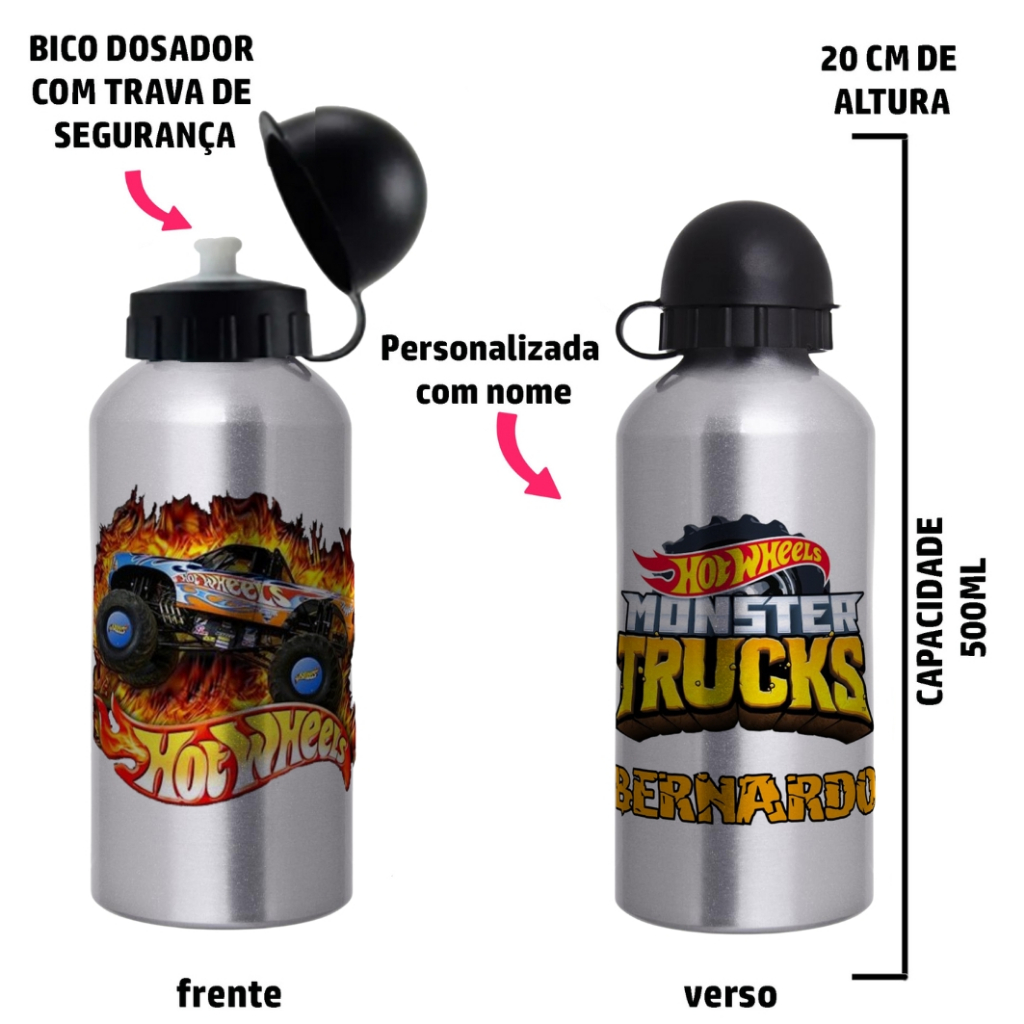 Garrafa Squeeze Infantil de alumínio com 500ml - Personalizada com nome - Monster Truck