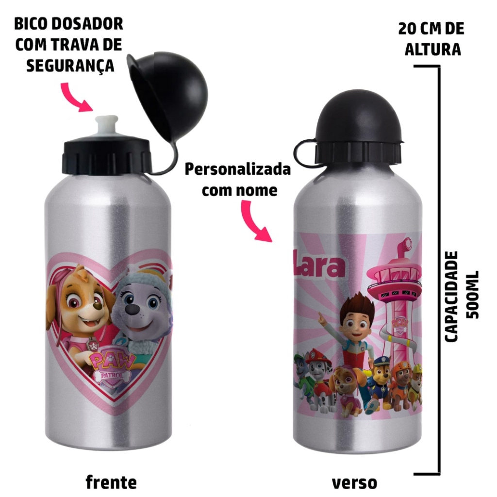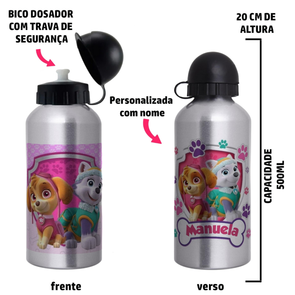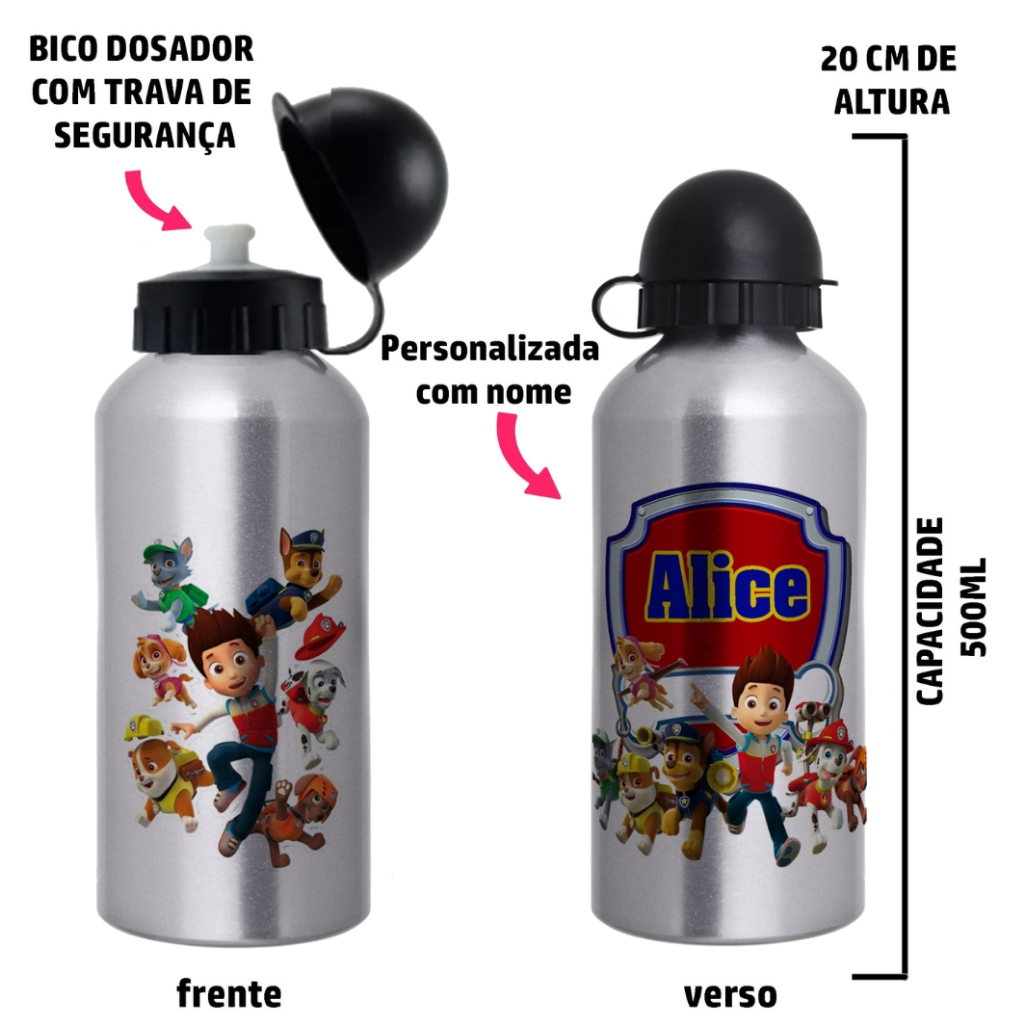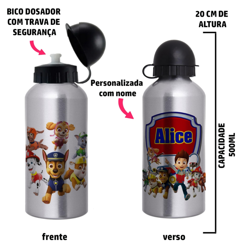 Garrafa Squeeze de alumínio infantil - Patrulha Canina com nome