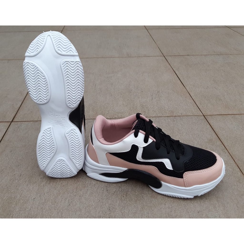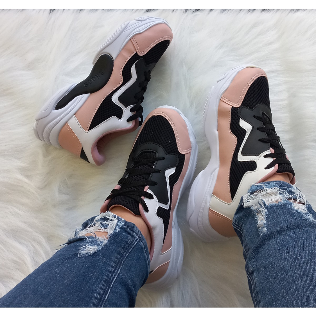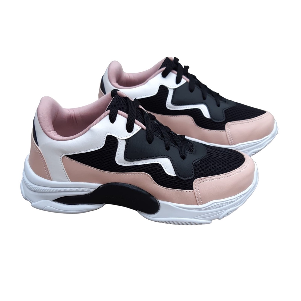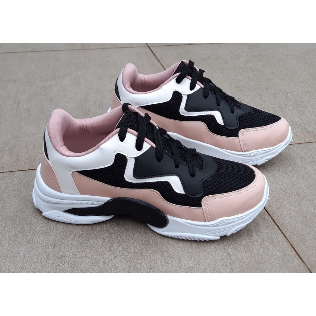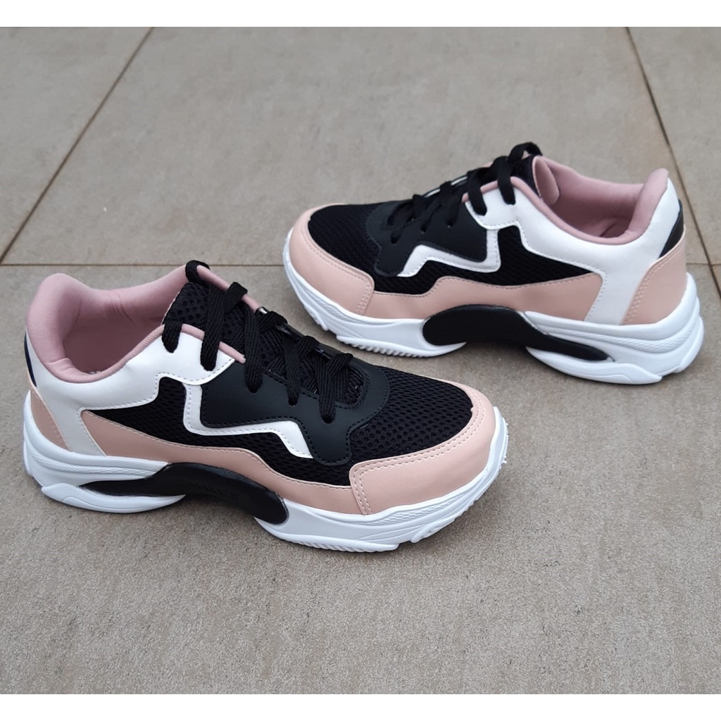 Tênis Feminino Casual Rosa Preto Branco Plataforma Chunky Blogueira Sola Alta Leve Confortável