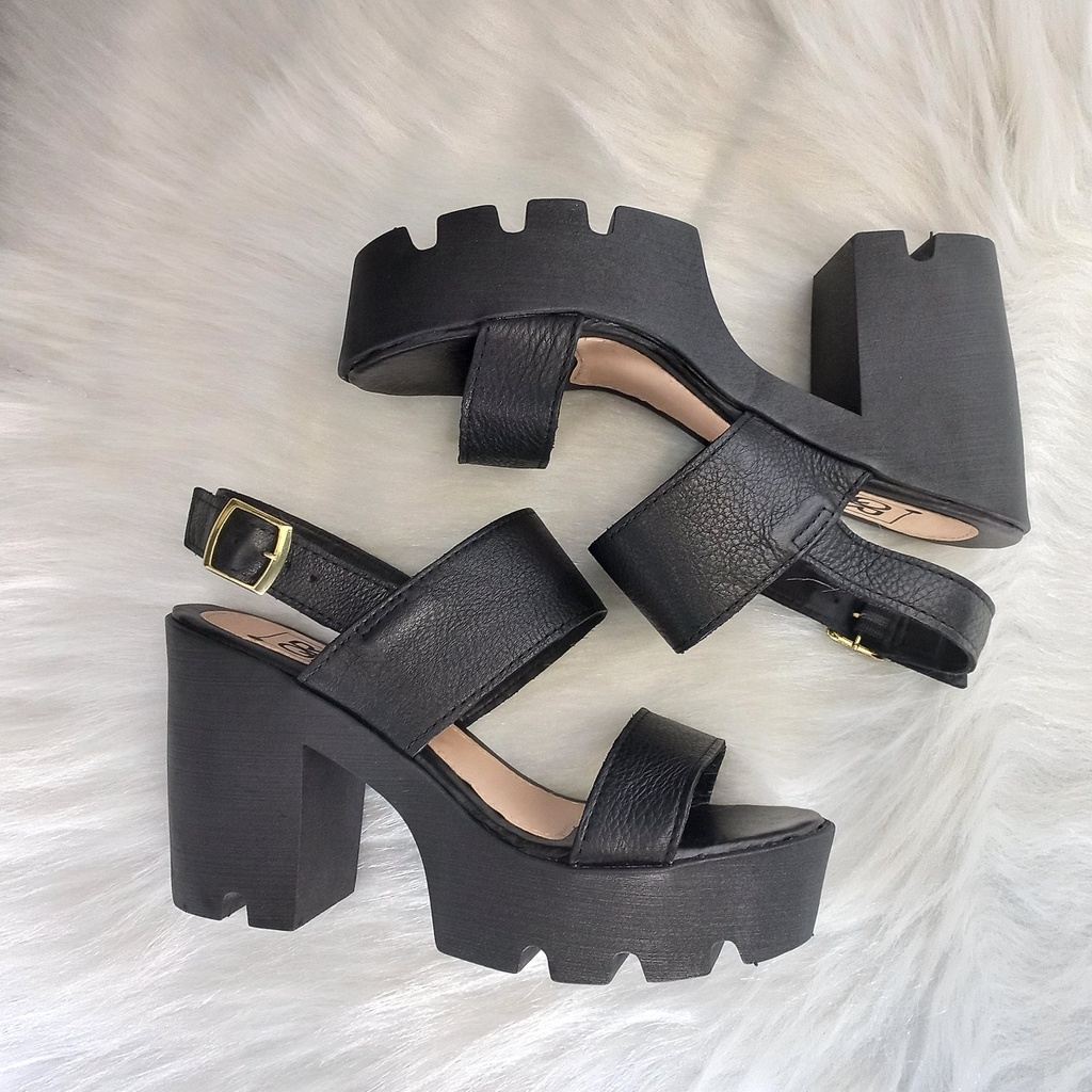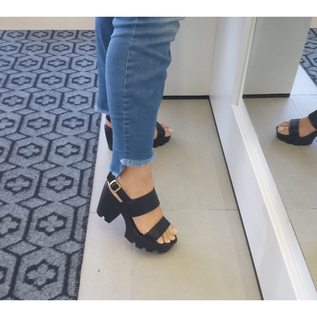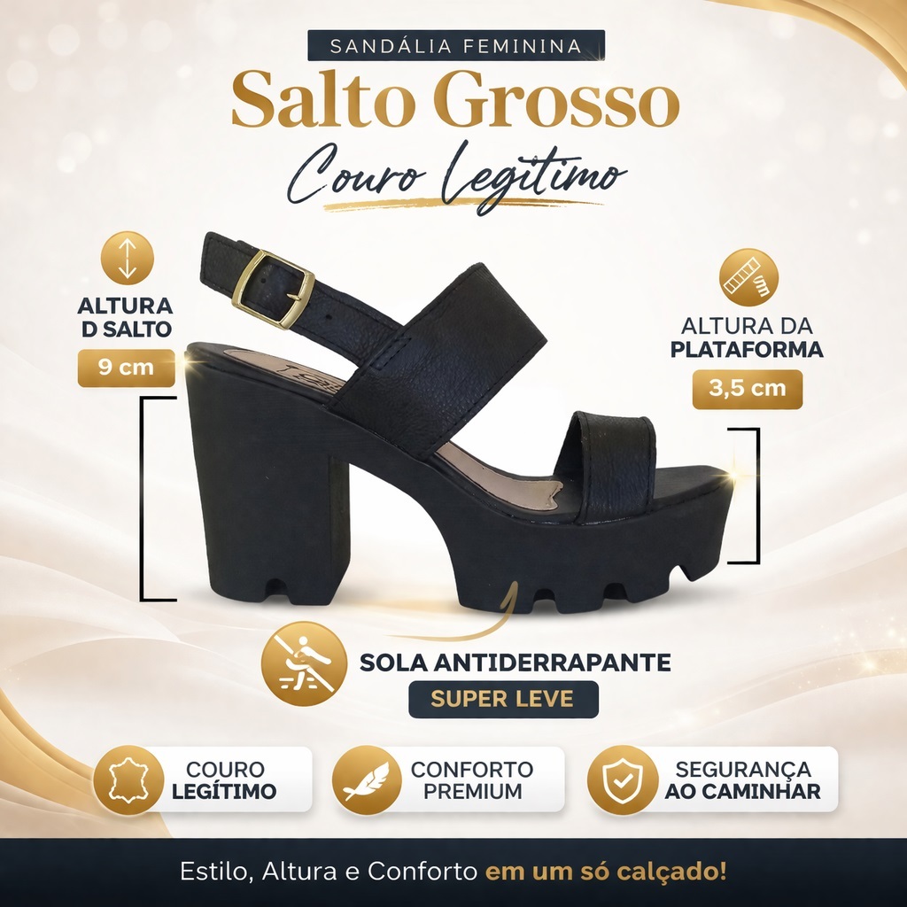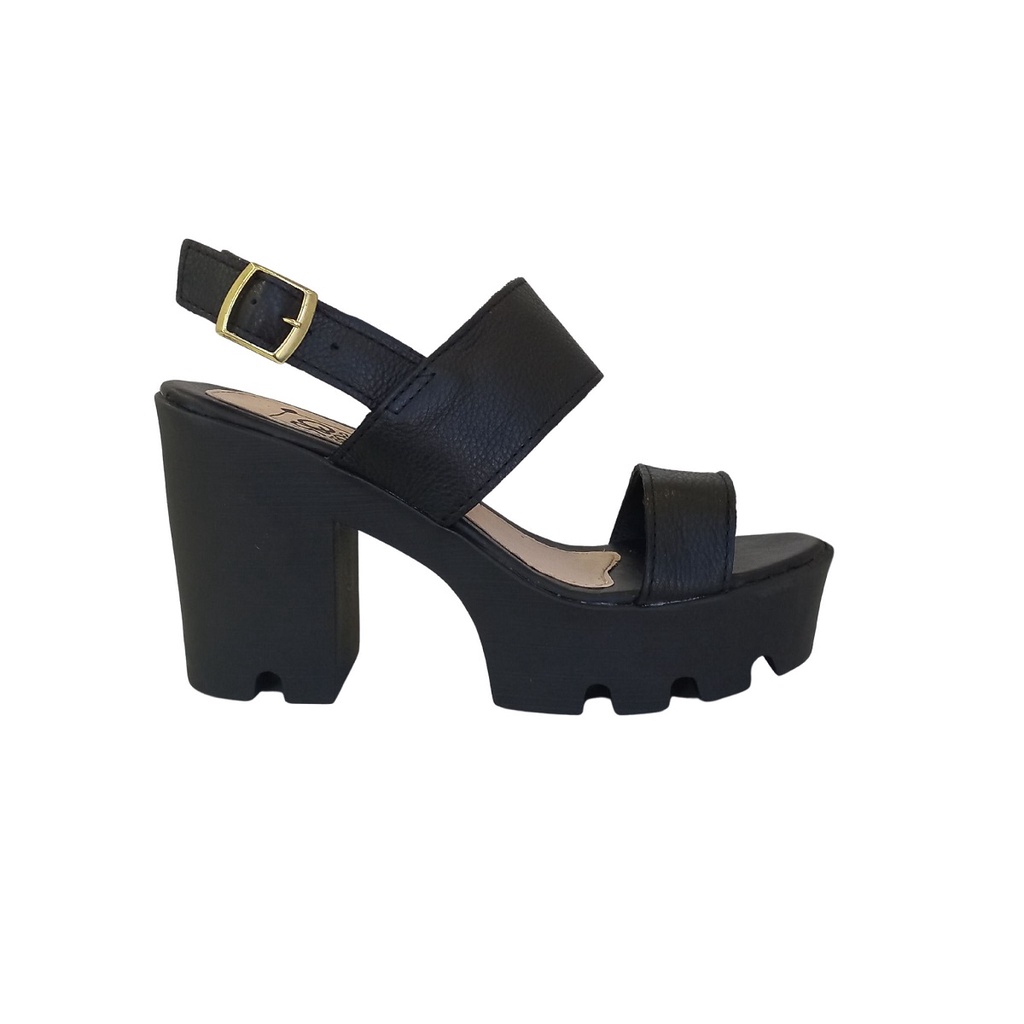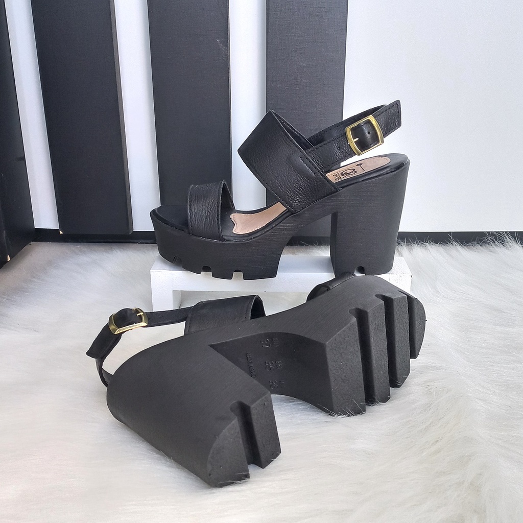 Sandália Feminina Tratorada Em Couro Legítimo Preta Salto Alto Grosso Plataforma Conforto