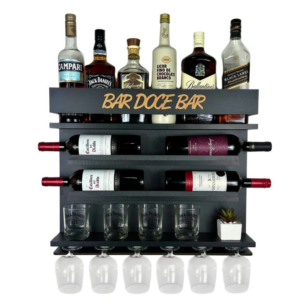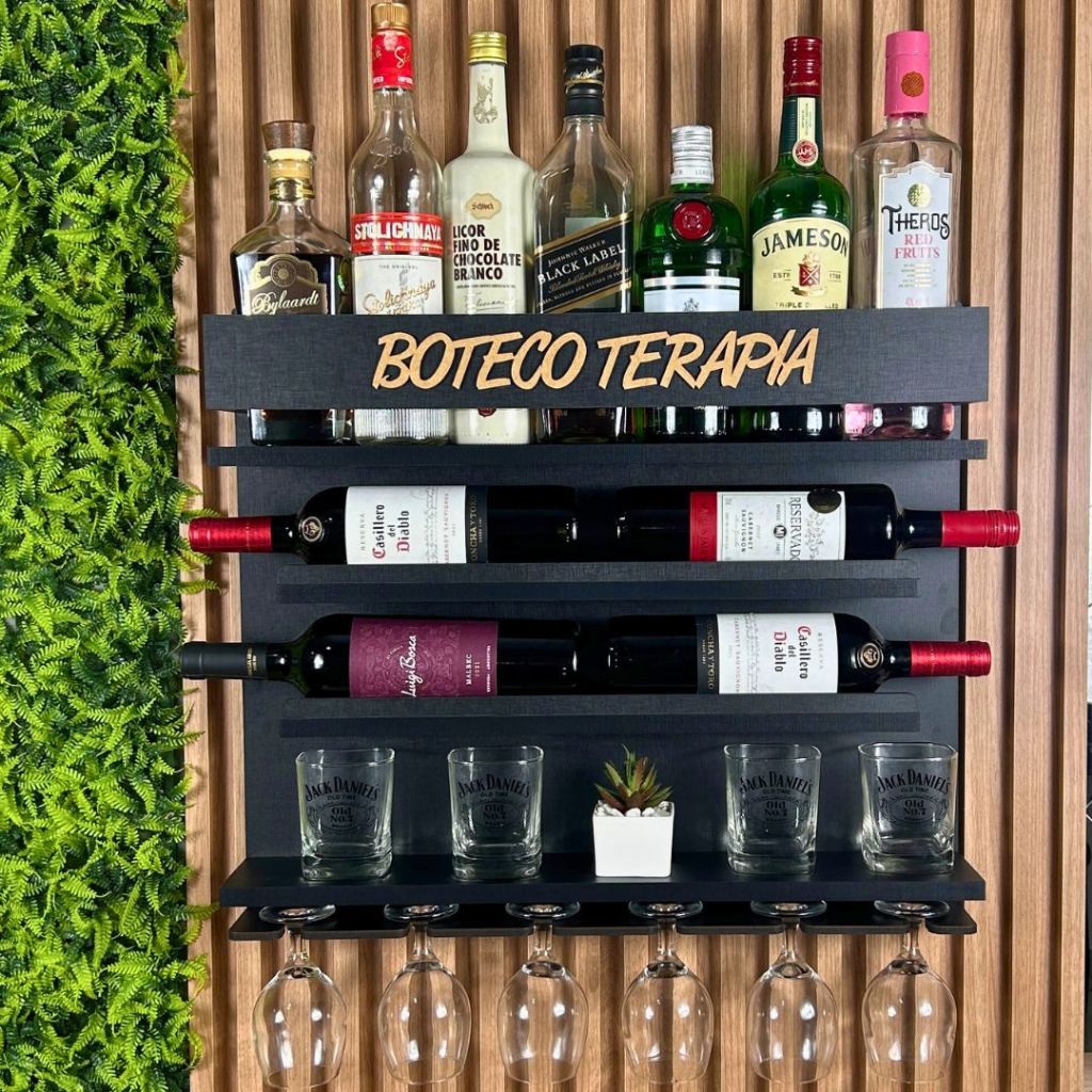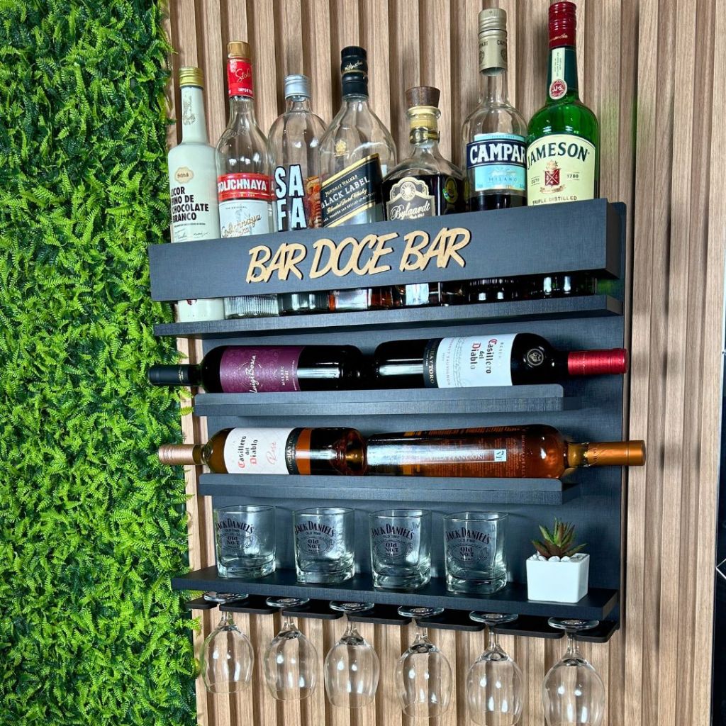 Barzinho com Adega de parede Decoração para Sala Expositor de Whisky com Porta Copos e porta taças varios modelos
