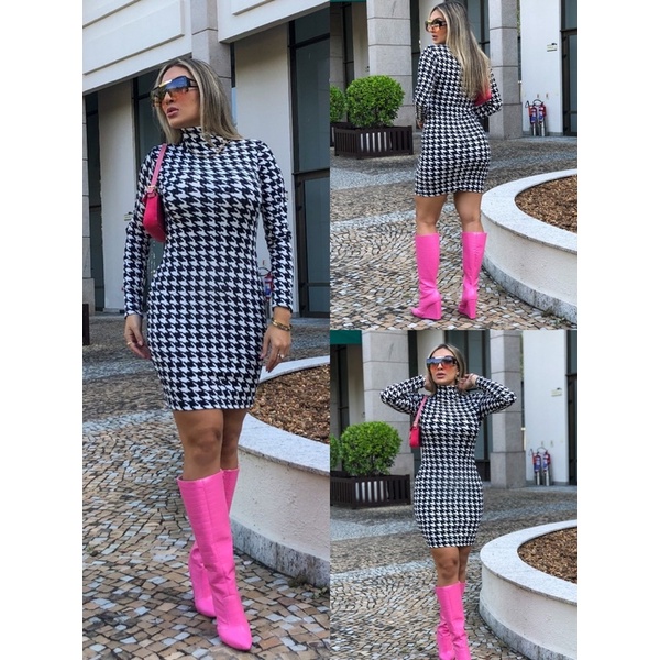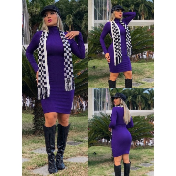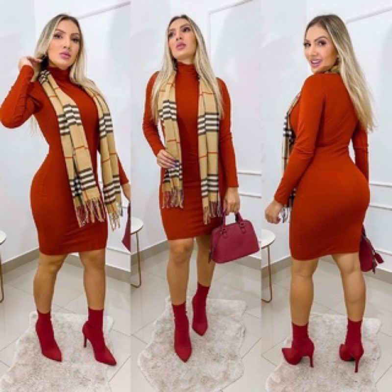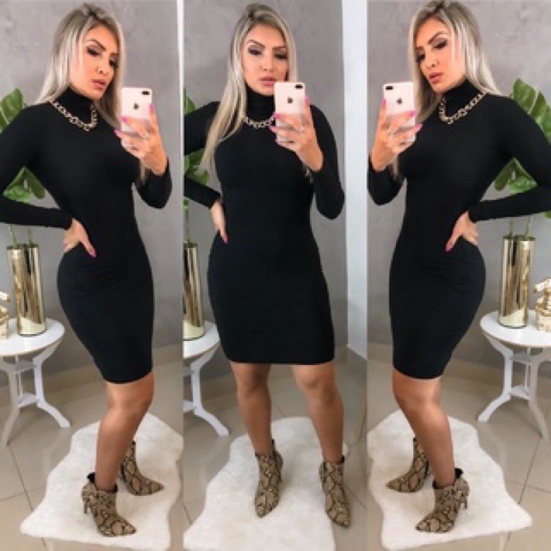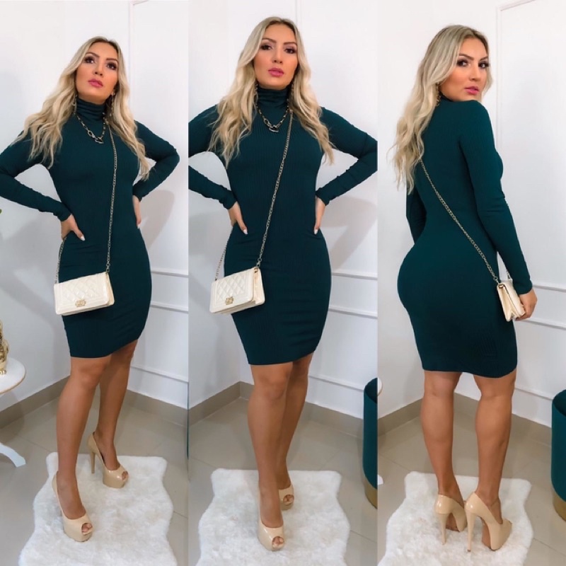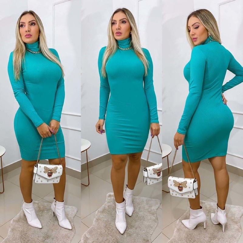 Vestido Justo Feminino Canelado Manga Longa Gola Alta Moda Casual Elegante