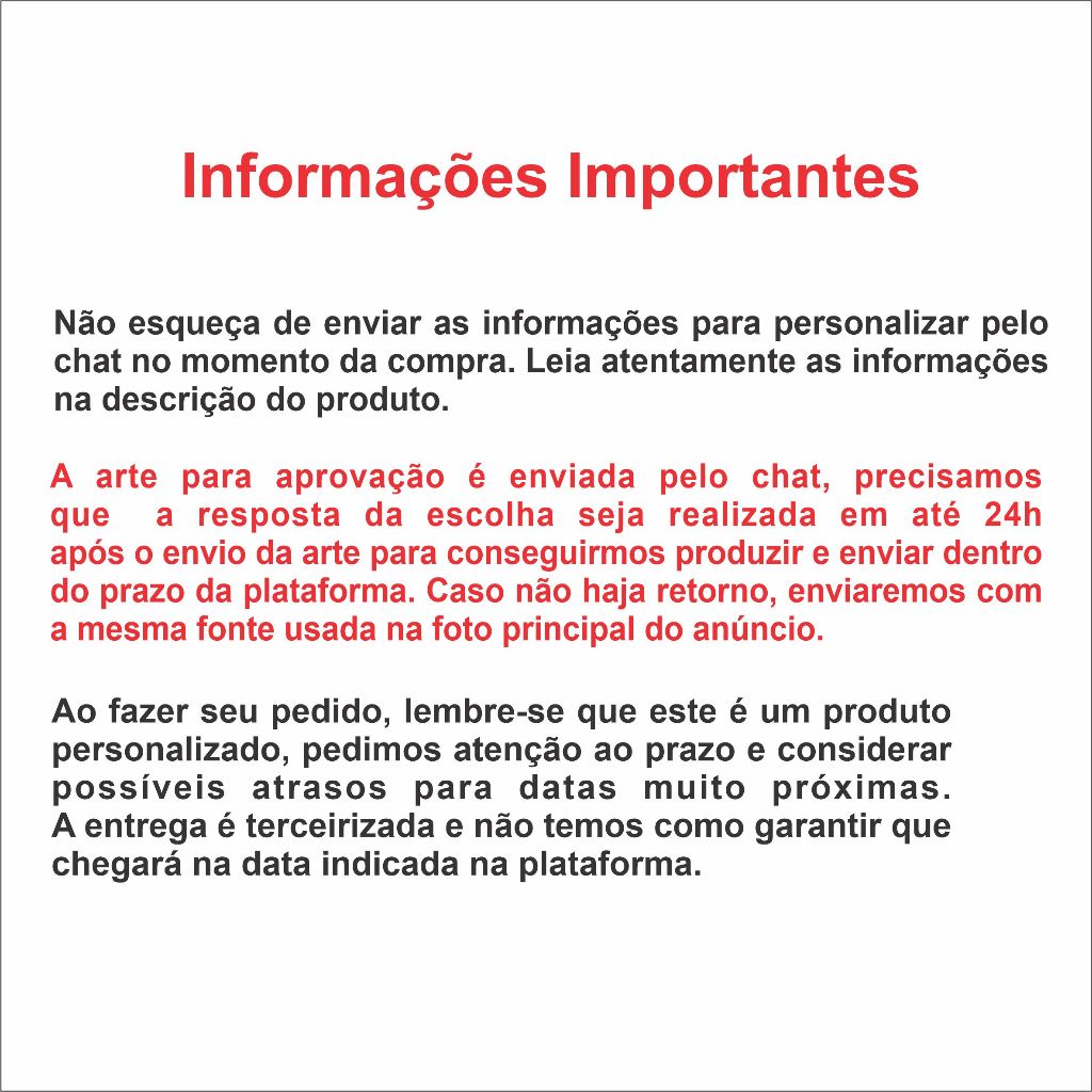 Sob encomenda: envio após 15 dias da compra