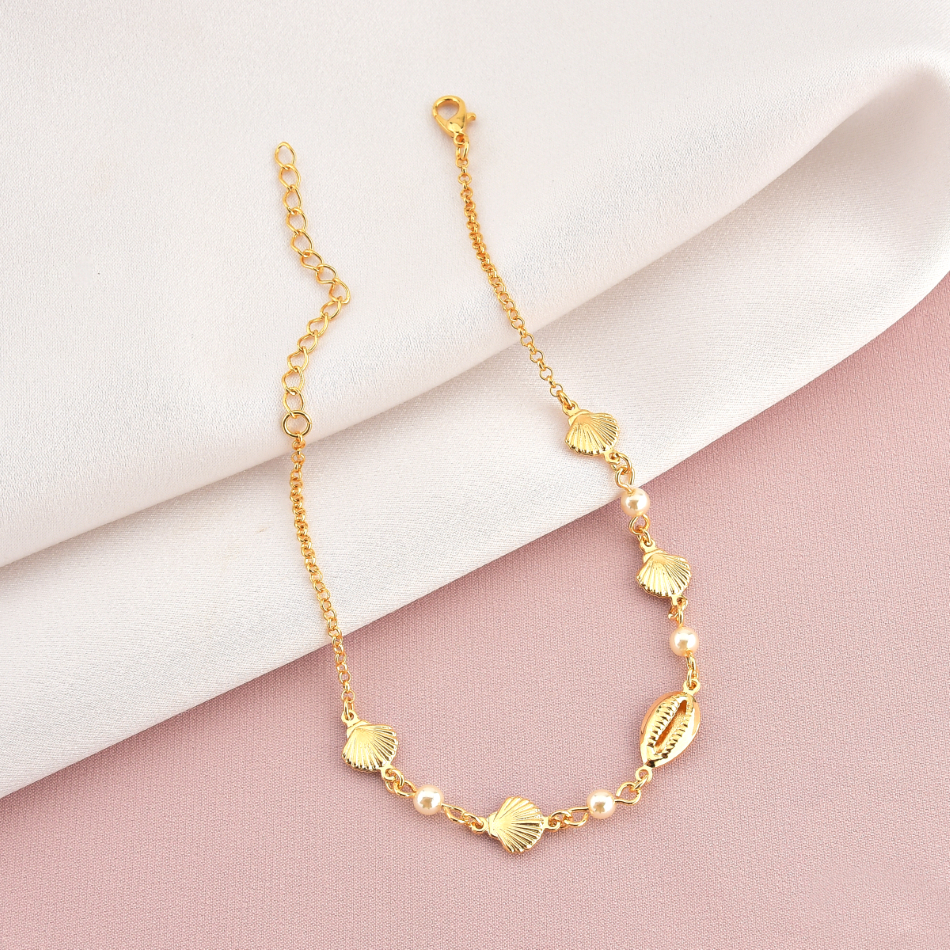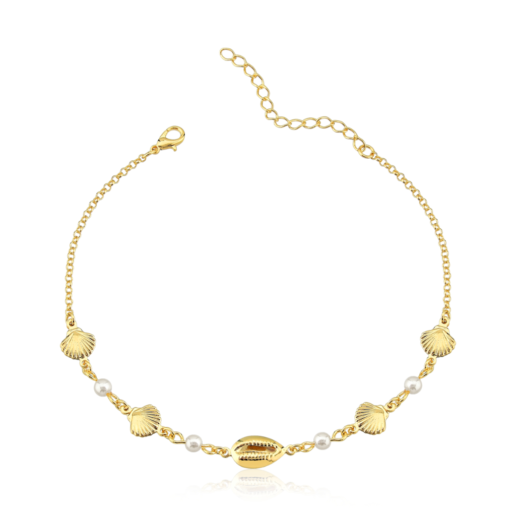 Tornozeleira Feminina Dourada Folheada a Ouro 18k Com Conchas Pérolas e Búzio semijoia