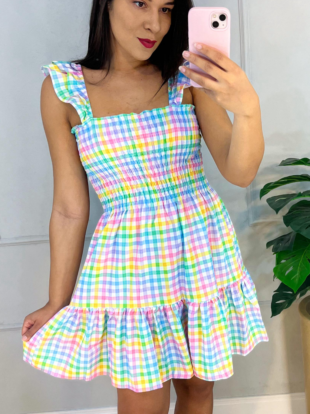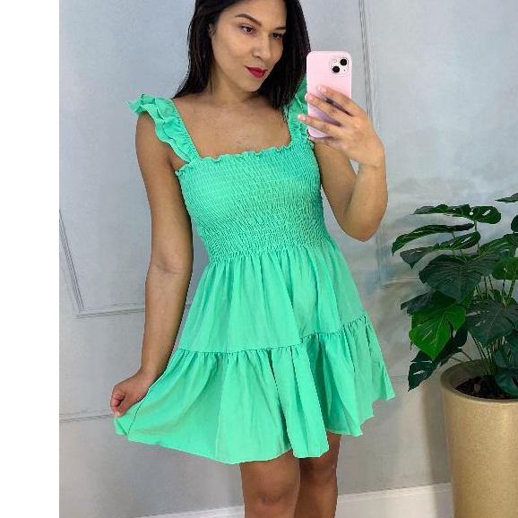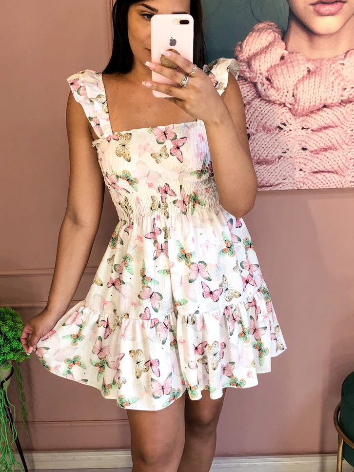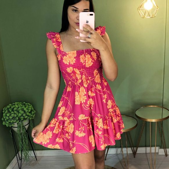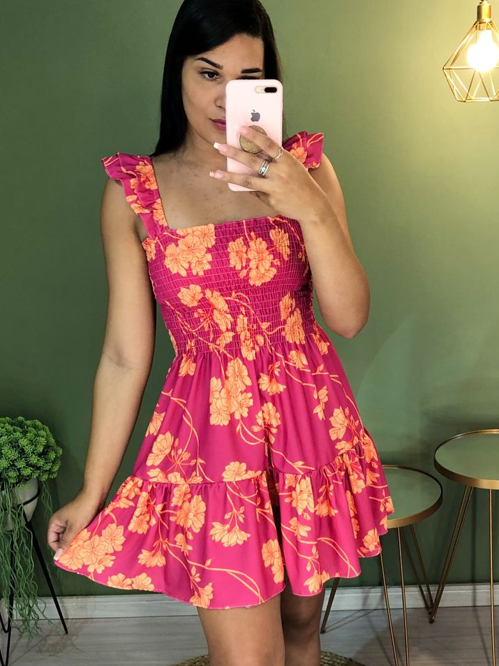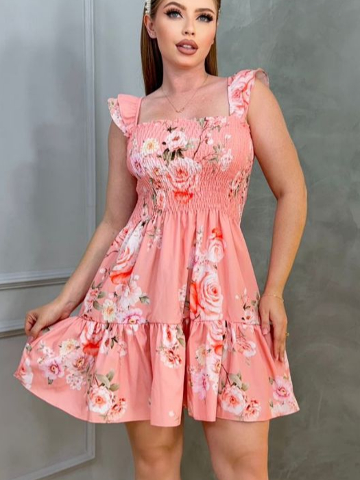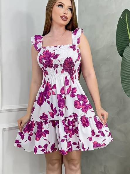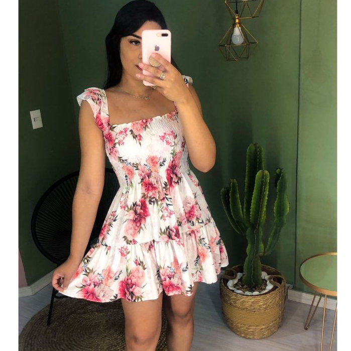 vestido alça curto babado floral lastex estmpado