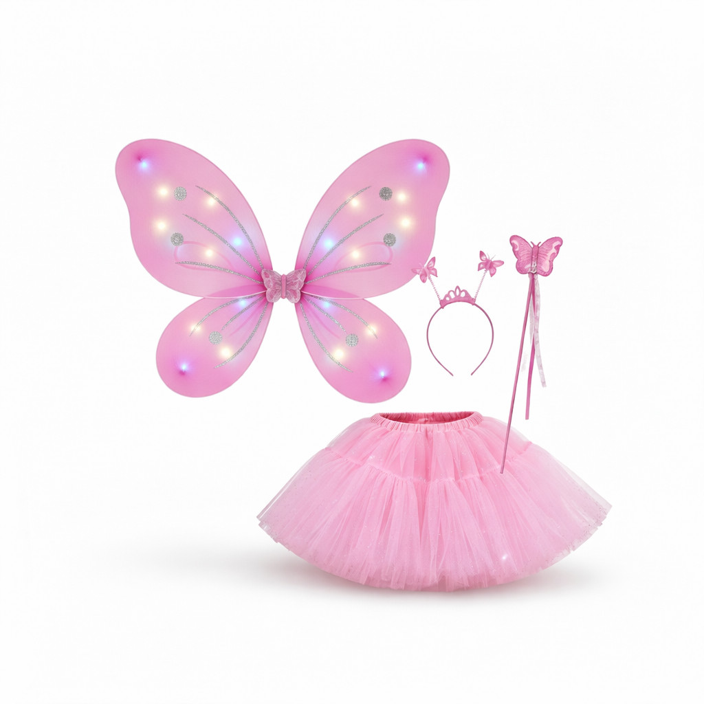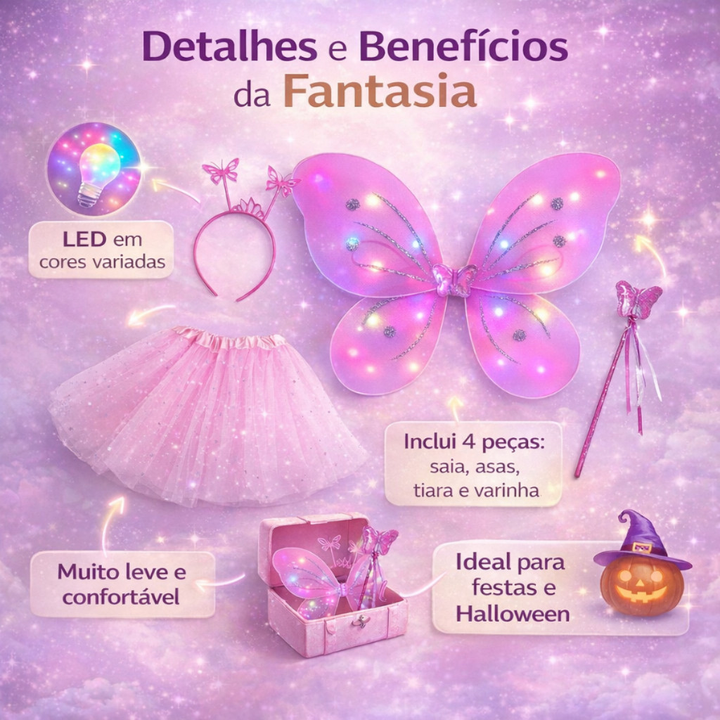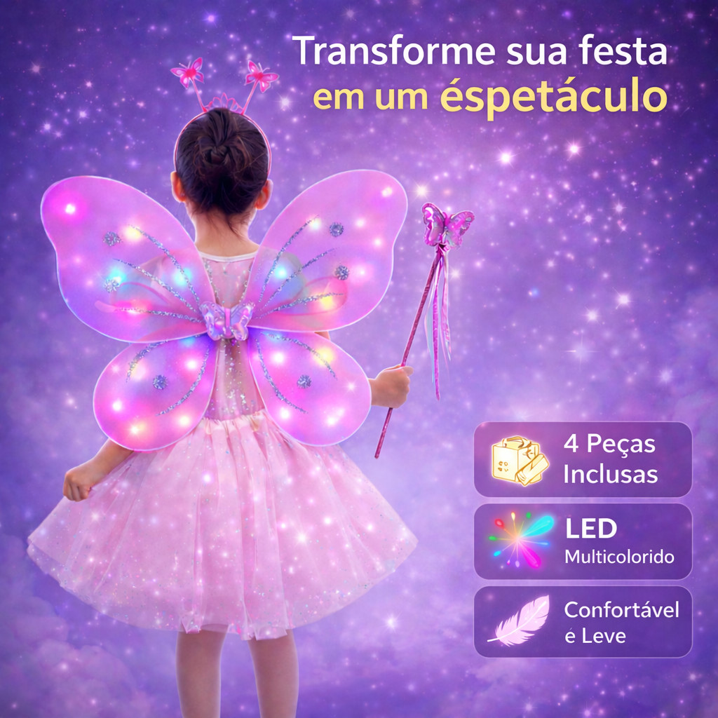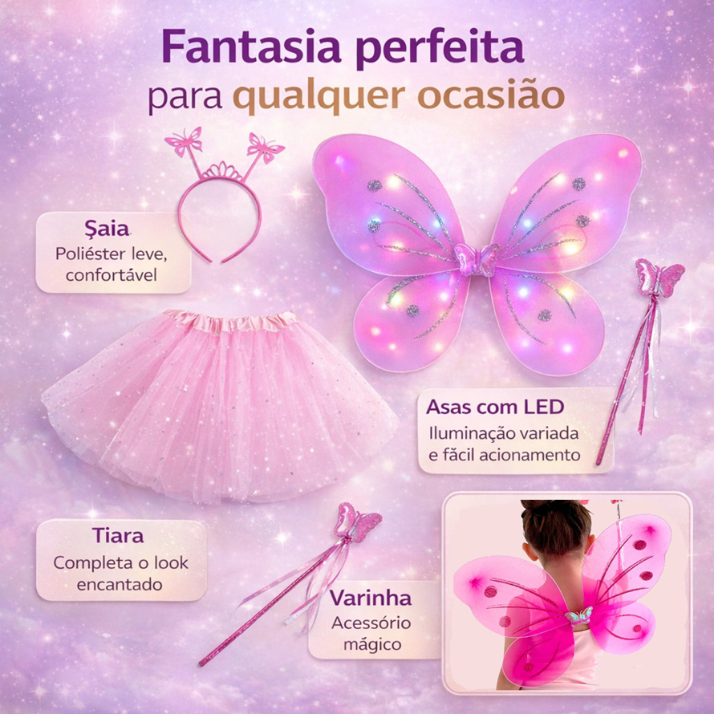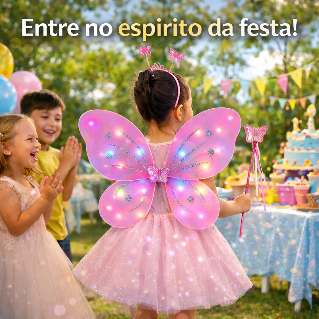Kit Fantasia Carnaval Borboleta Asa Saia Tule Infantil Menina COM LED Tiara Varinha