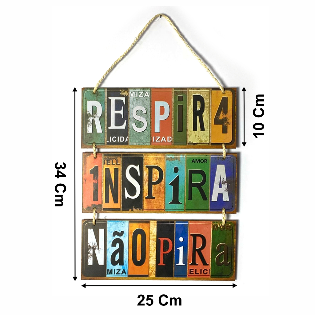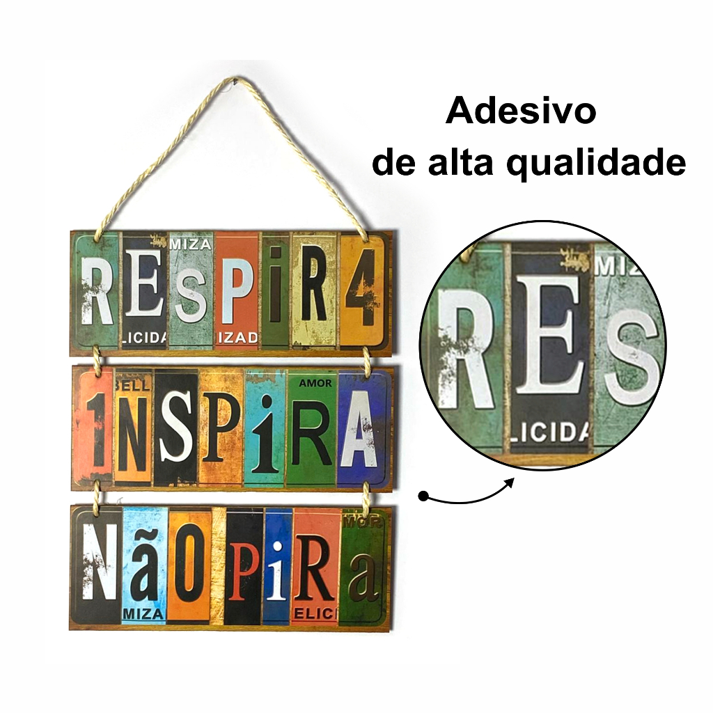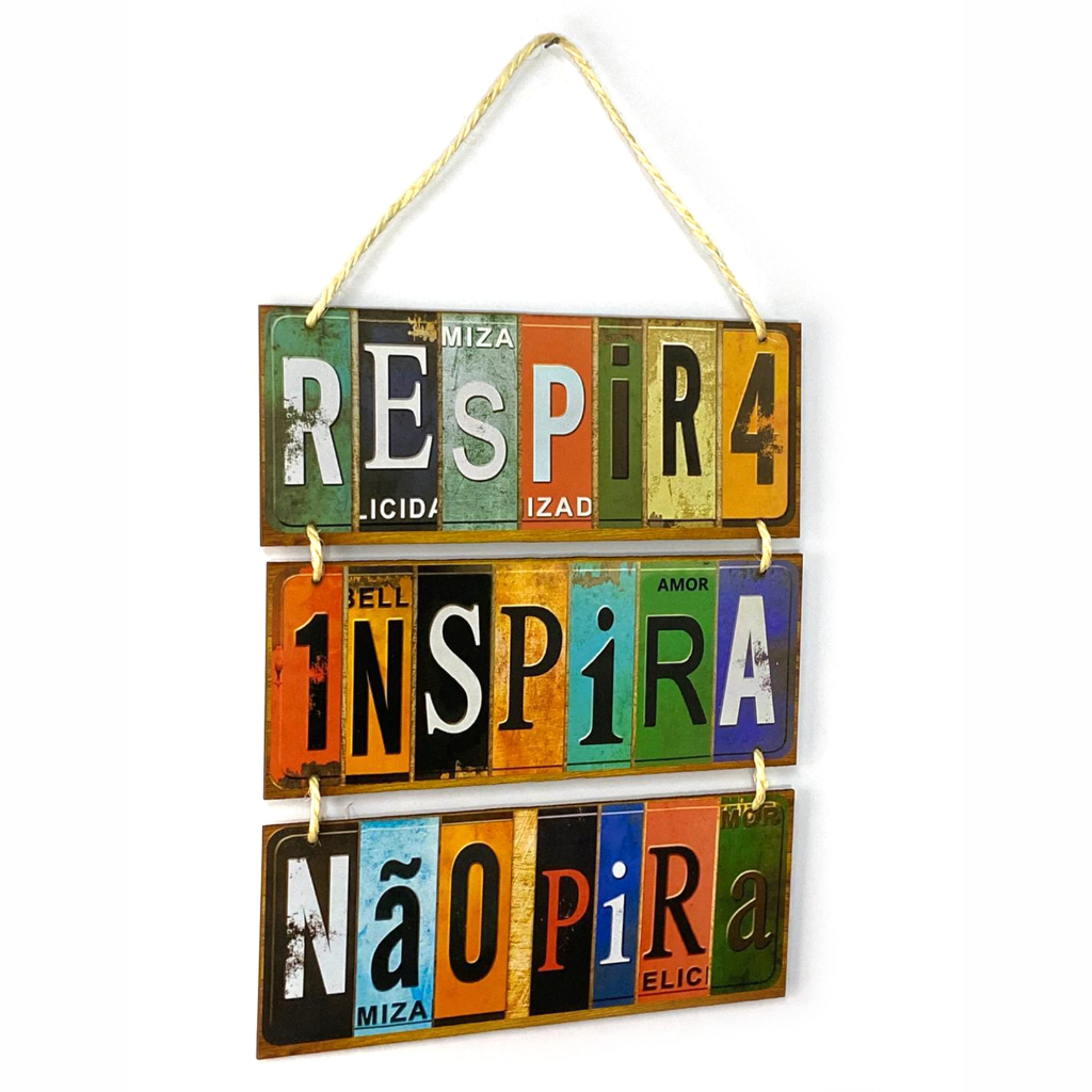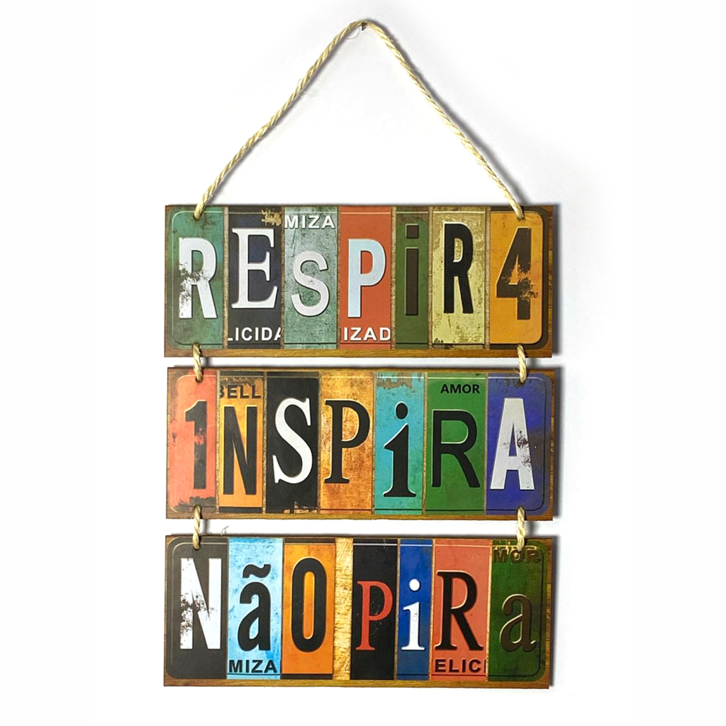 Placa Decorativa em MDF Suspensa com Corda de Sisal - Respira Inspira Não Pira - 3 partes de Parede