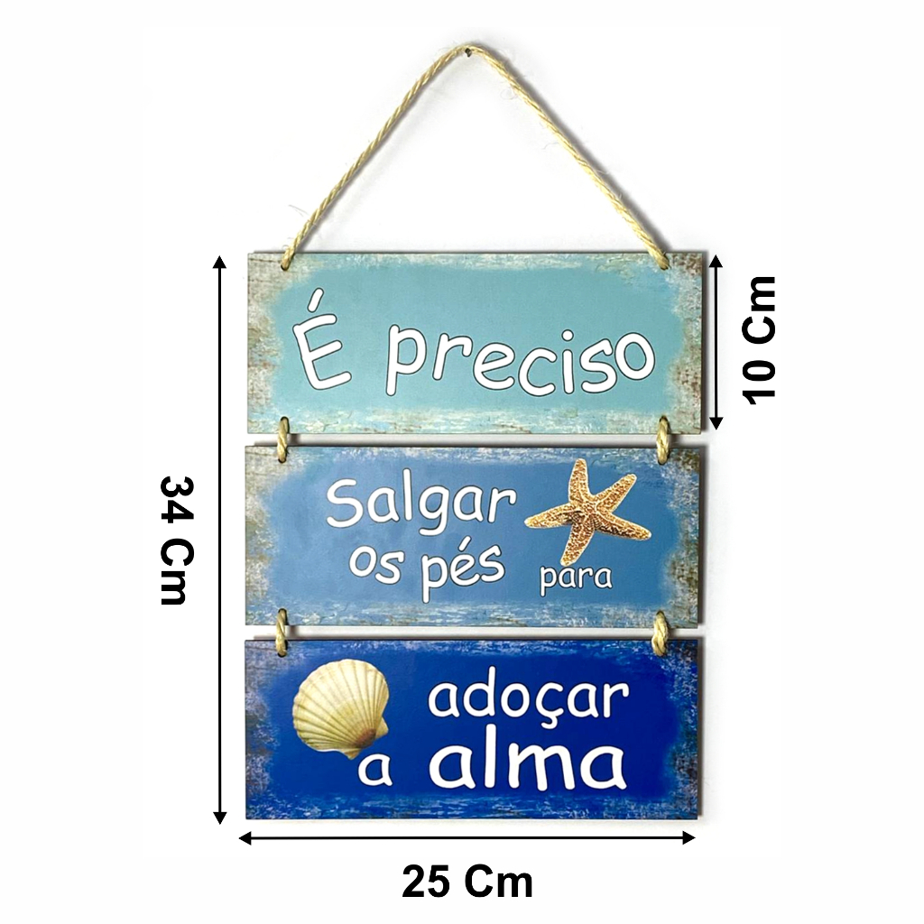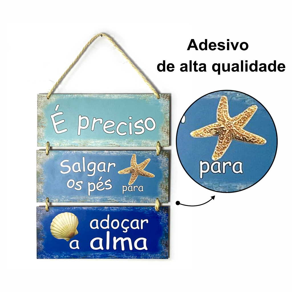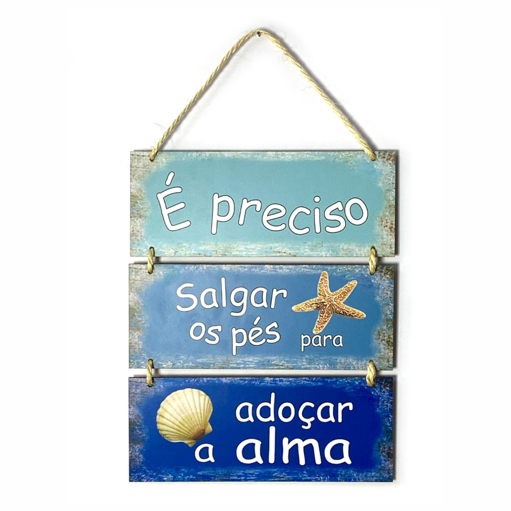 Placa Decorativa Suspensa em MDF com Corda de Sisal Frase É Preciso Salgar os Pés Parede 3 Partes
