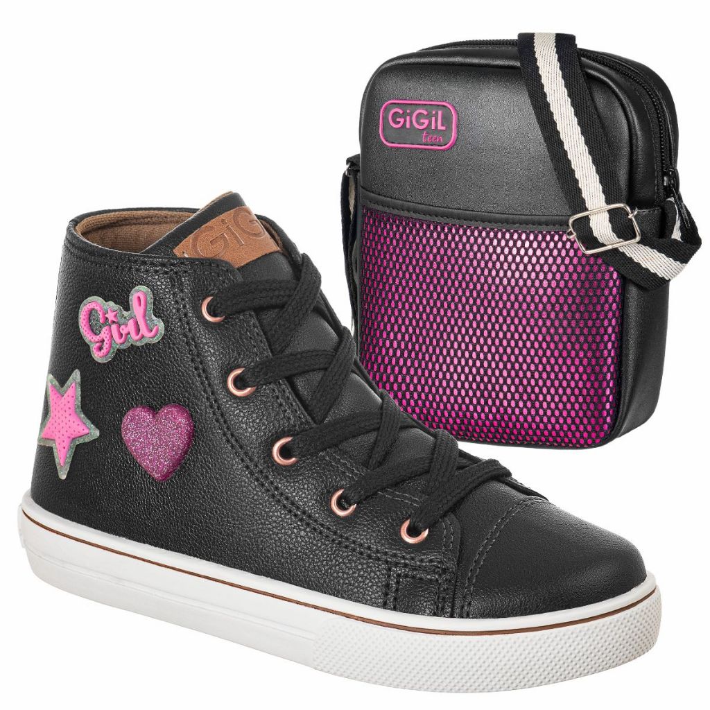 Kit Tenis Infantil GiGiL Teen Feminino Enfeite Brilho Cano Alto Escolar Confortável Cadarço Com Bag Ombro Transversal