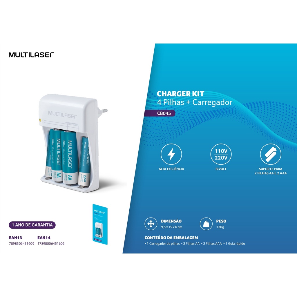 Carregador de Pilhas Multilaser 2 X Aa+ 2 X Aaa
