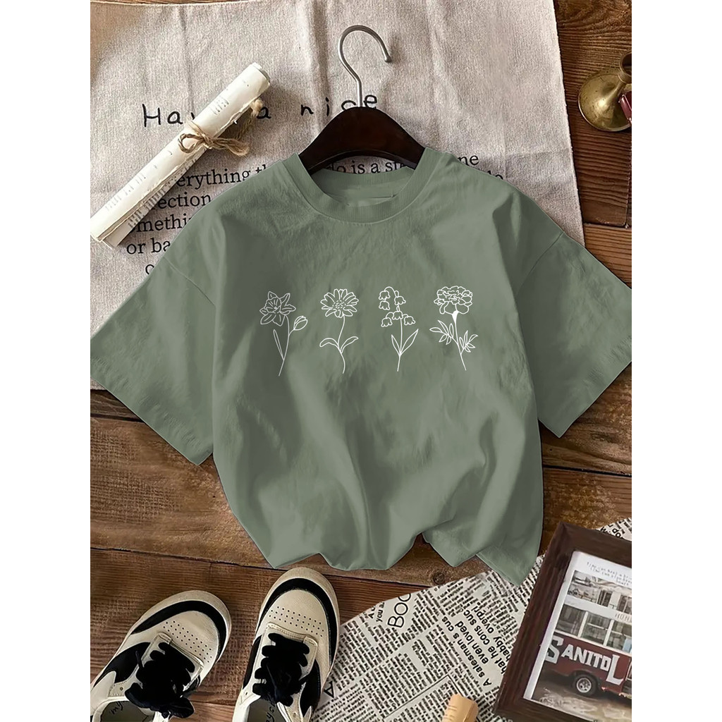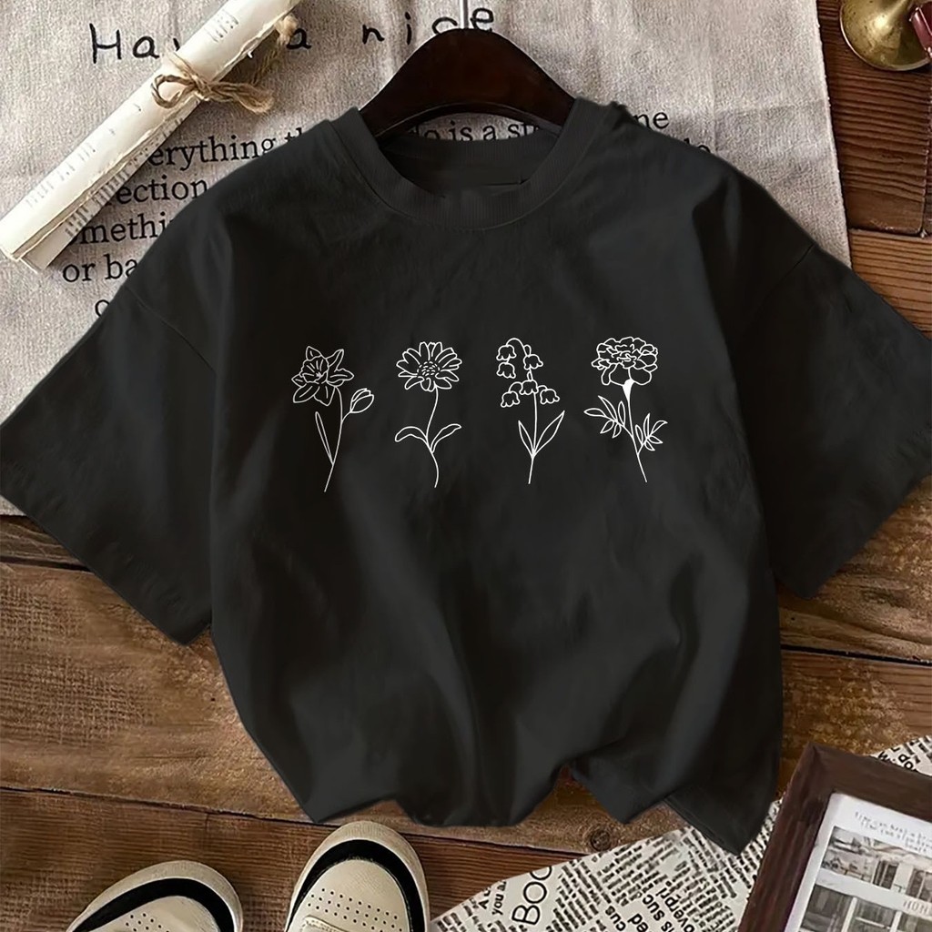 Camiseta com Estampa de Flores, Manga Curta e Gola Redonda Casual para Verão & Primavera, Roupas Femininas