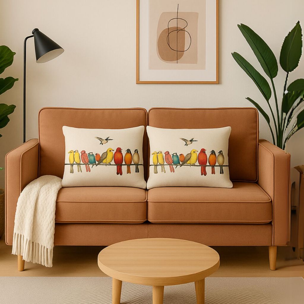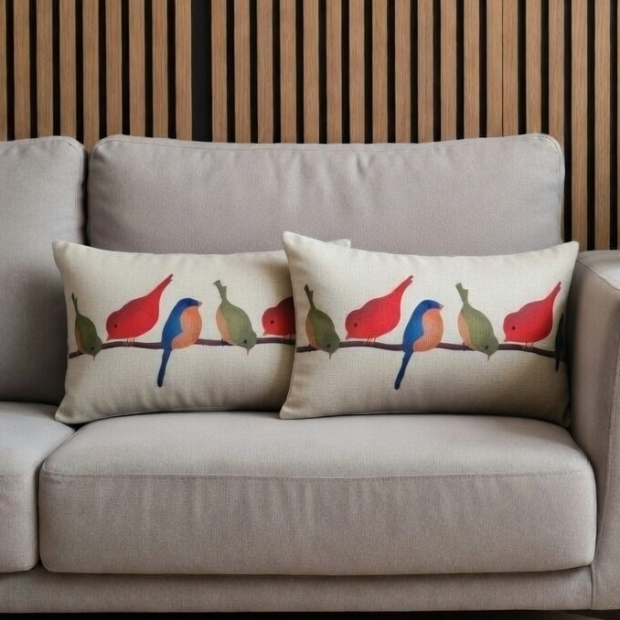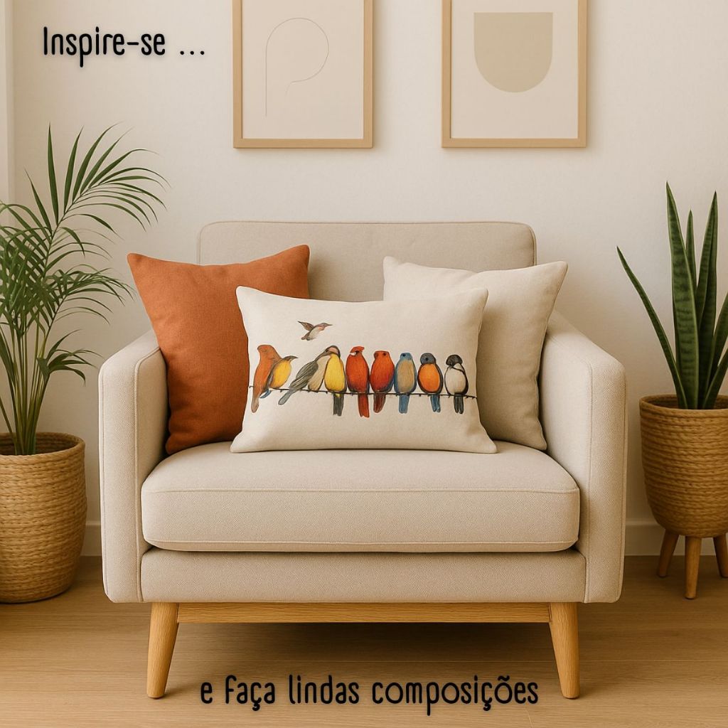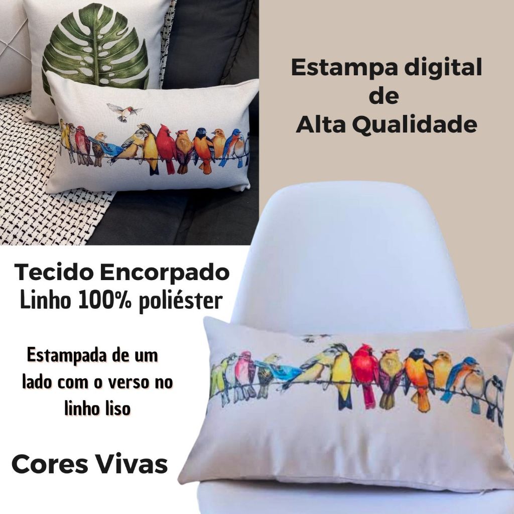 Kit 2 Capas Almofadas Retangular Linho Passarinhos Coloridos no Fio Decoração de sofá cama 30x50