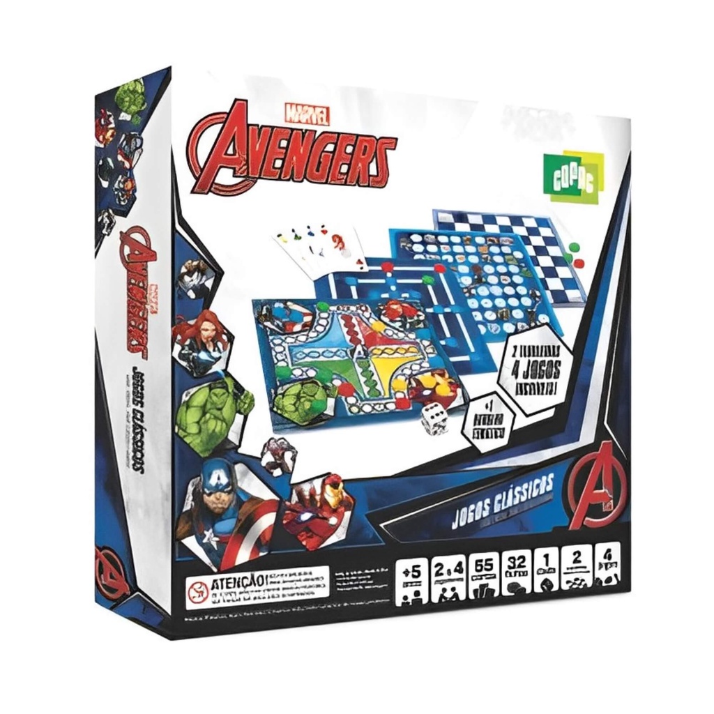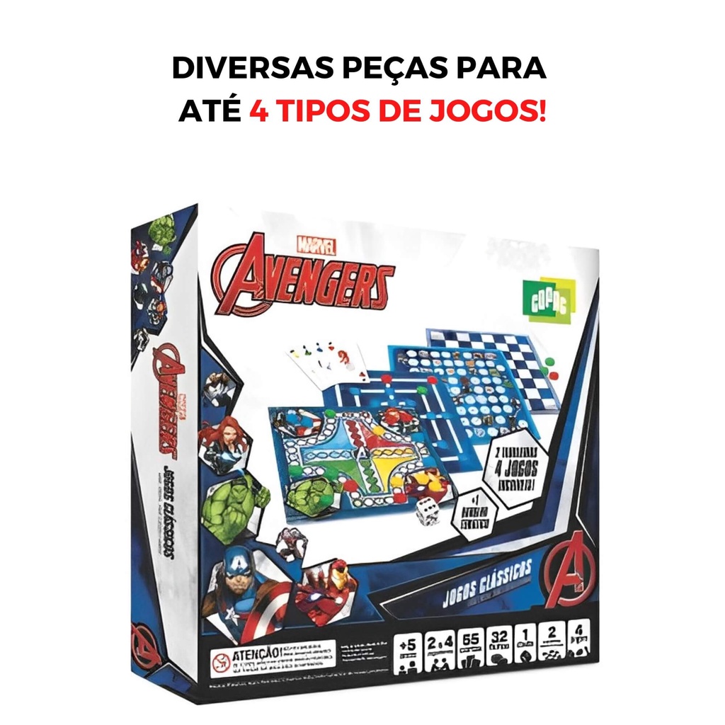 Kit 4 Jogos Clássicos de tabuleiro para jogar com a familia e amigos Marvel Avengers Dama, Ludo, Trilha e Sobe e Desce Brinquedo infantil para crianças - Copag 32511