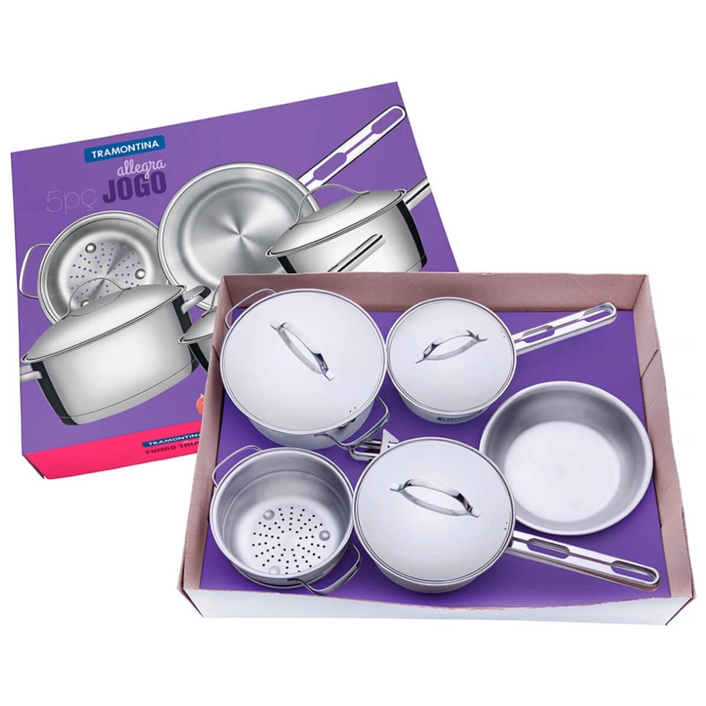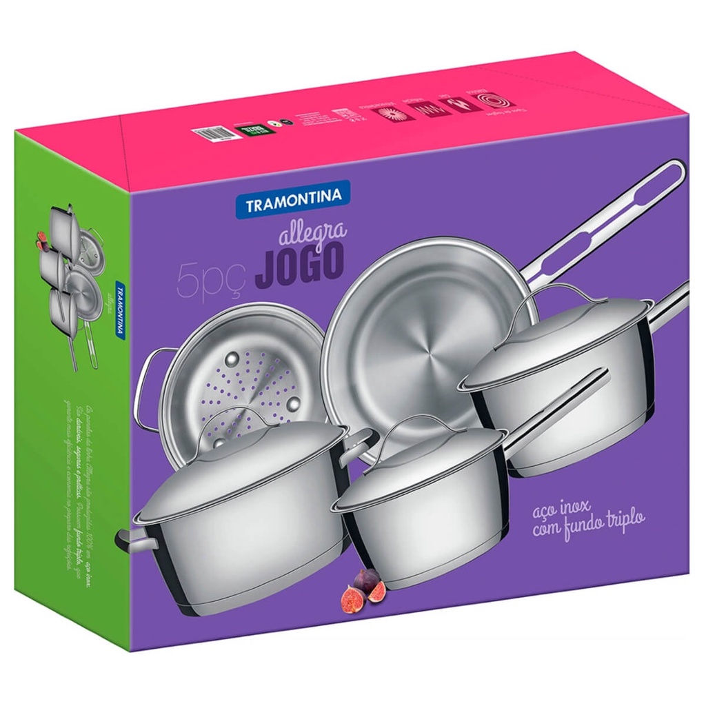 Jogo de Panelas Tramontina Allegra em Aço Inox com Fundo Triplo e Tampas de Inox 5 Peças - 65650280