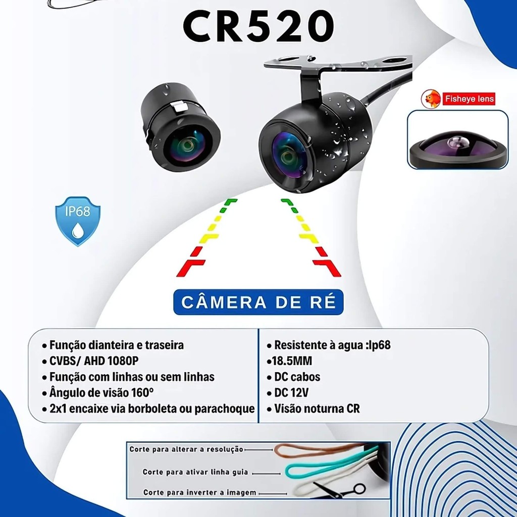 Câmera de Ré 2x1 Dianteira/Traseira CVBS/AHD 1080P Resistente à Água H-Tech CR520
