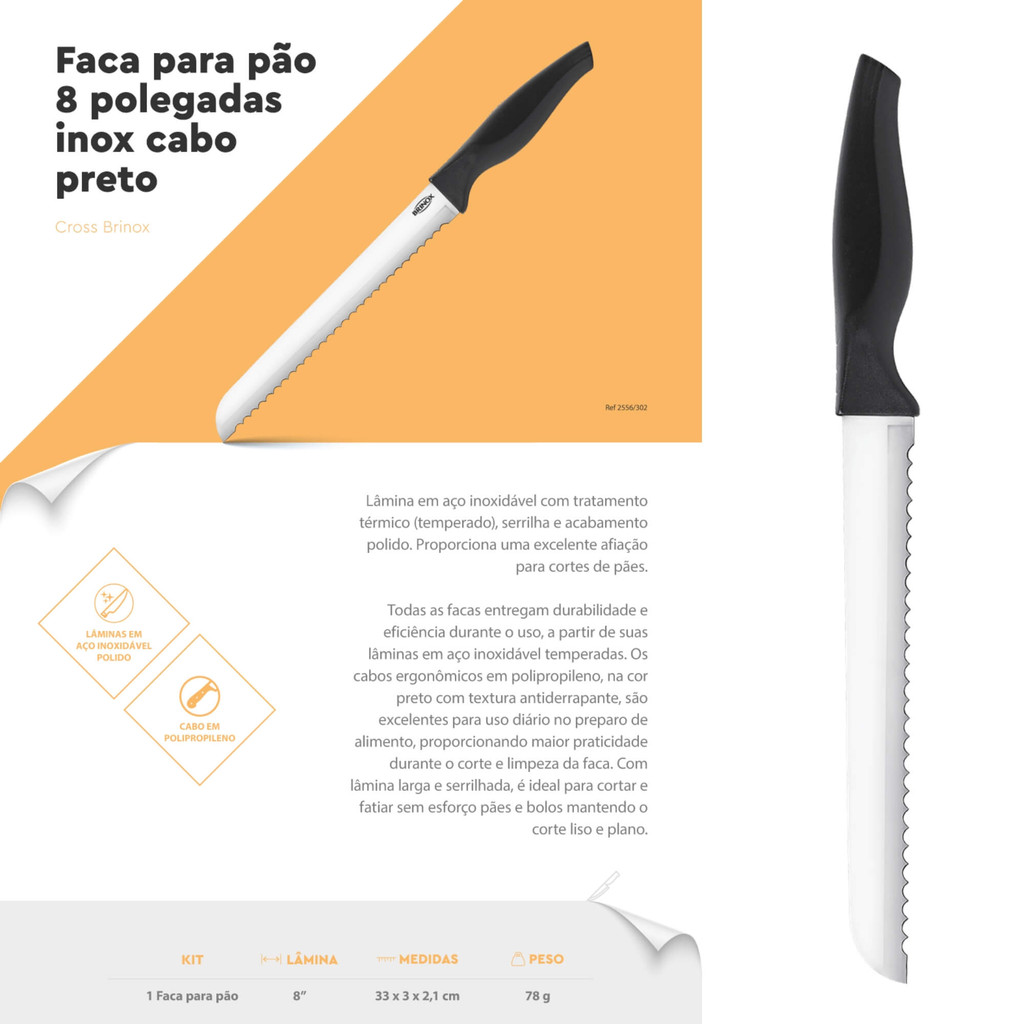 Faca p/ Pão 8" lâmina serrilhada aço inoxidável, polido e temperado cabo preto Brinox - 2556/302
