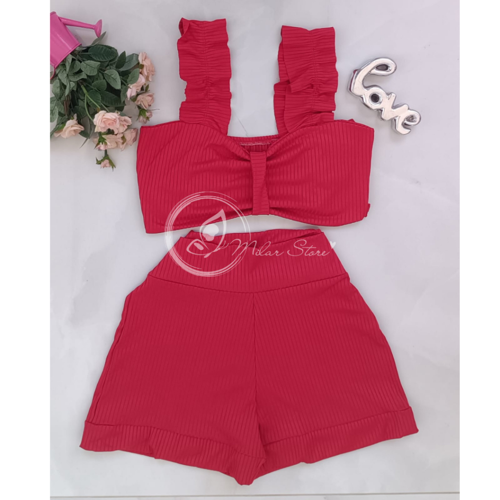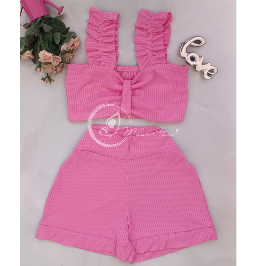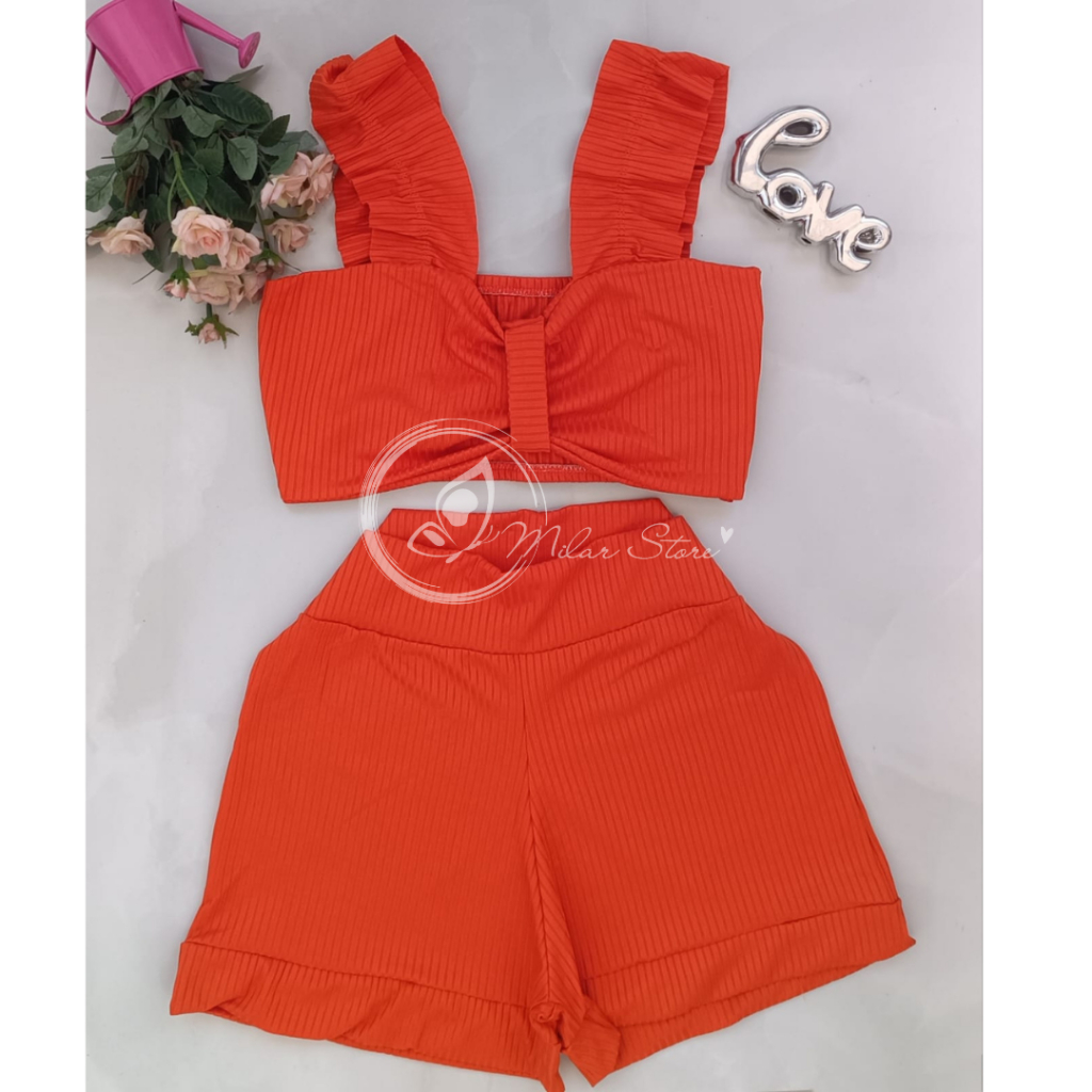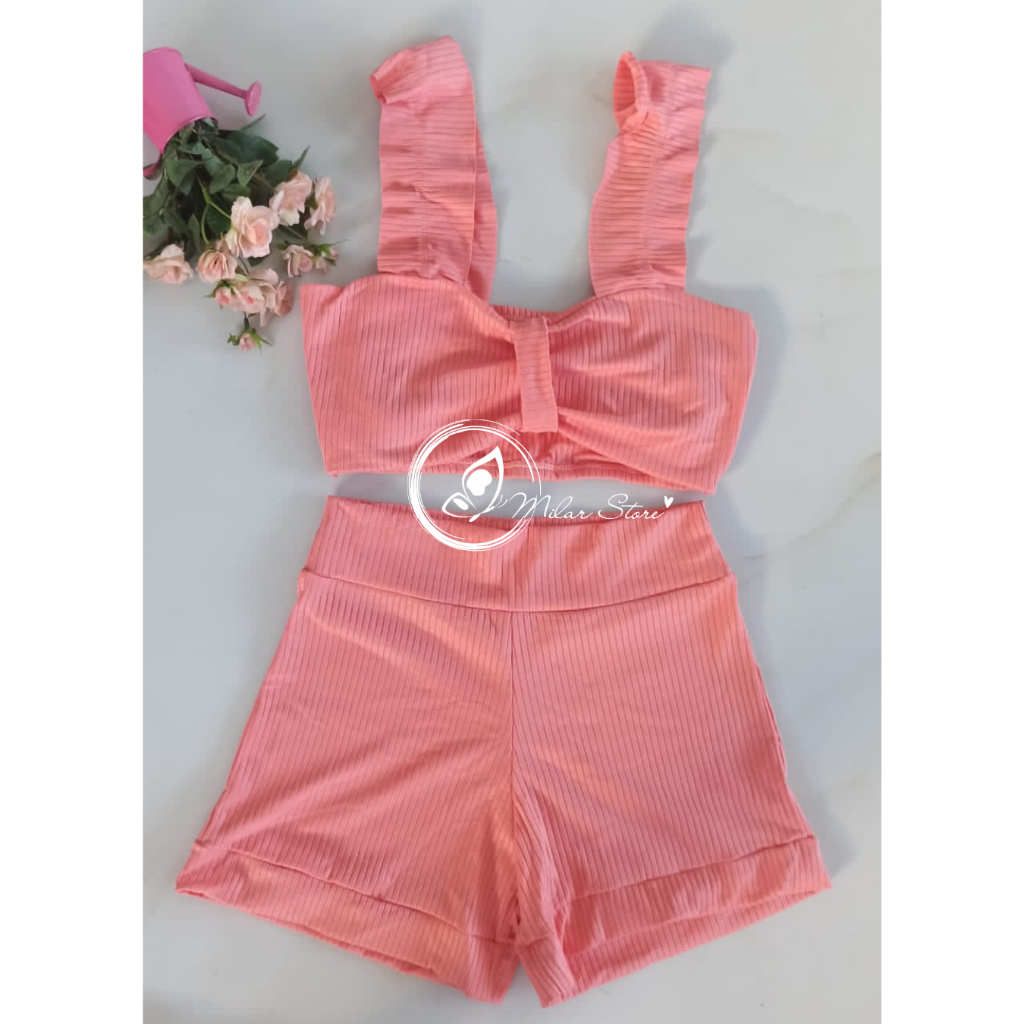 Conjunto Feminino Canelado Short Curto + Top Cropped Modinha Blogueira