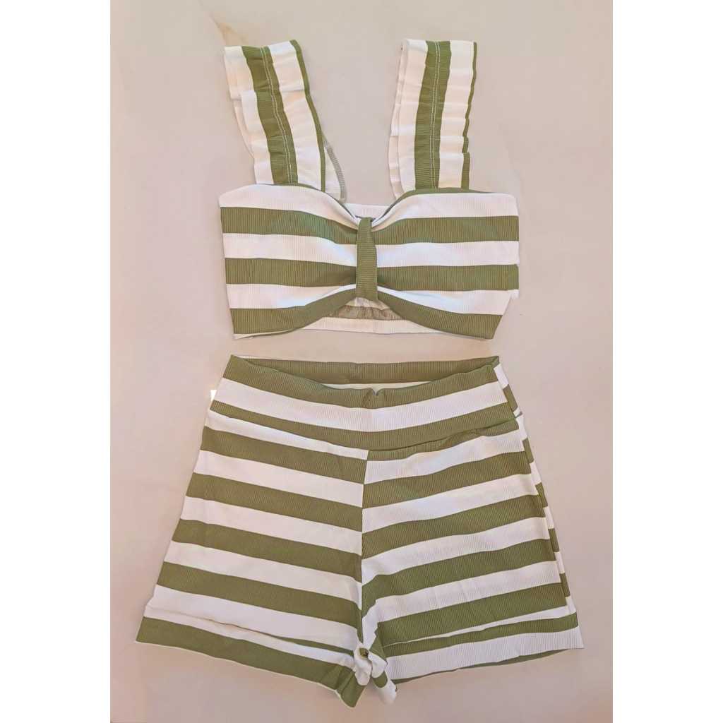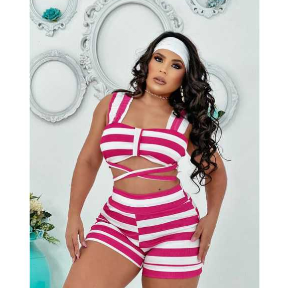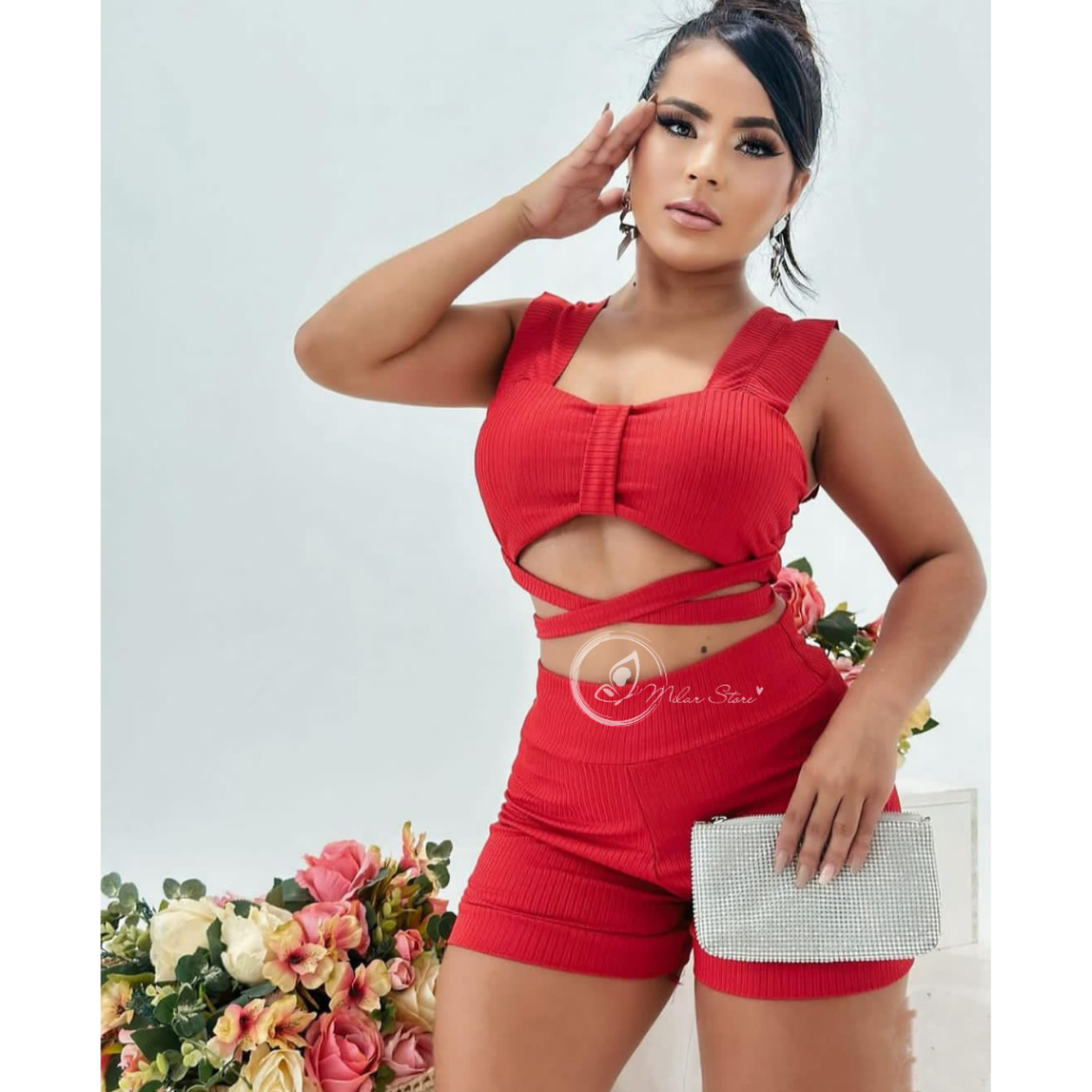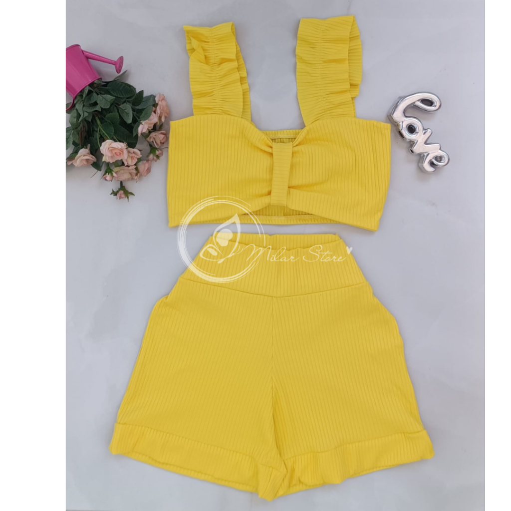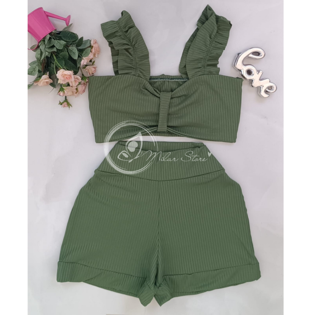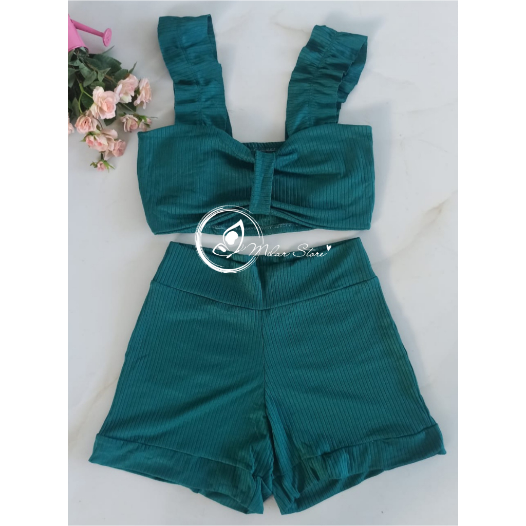 Conjunto Feminino Canelado Short Curto + Top Cropped Modinha Blogueira