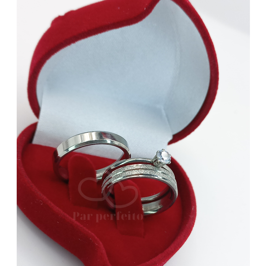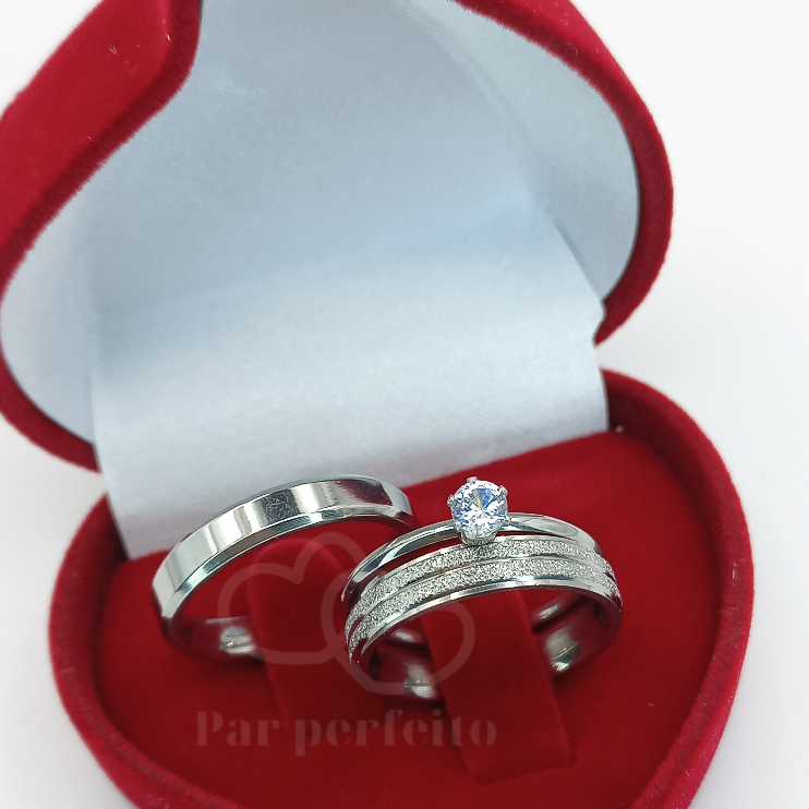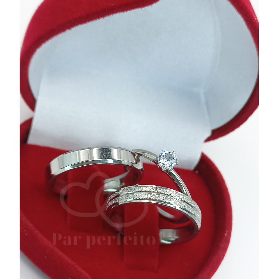 Par de Aliança de Namoro Casamento Brilhante Diamantada e Chanfrada Lisa 4mm + Anel Solitário de 2mm