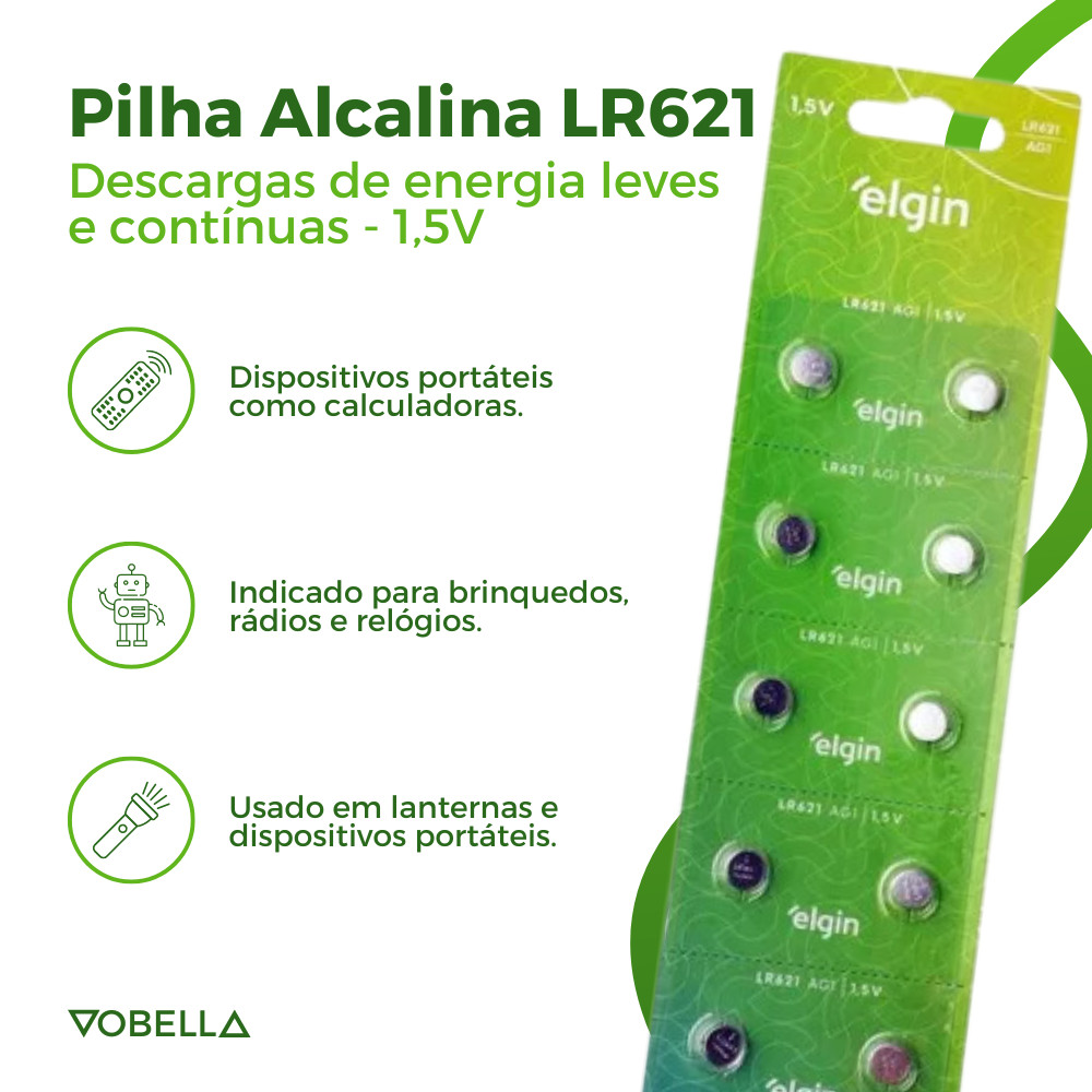 10 Baterias Pilhas Alcalina Lr621 1,5v Blister Cartela Elgin