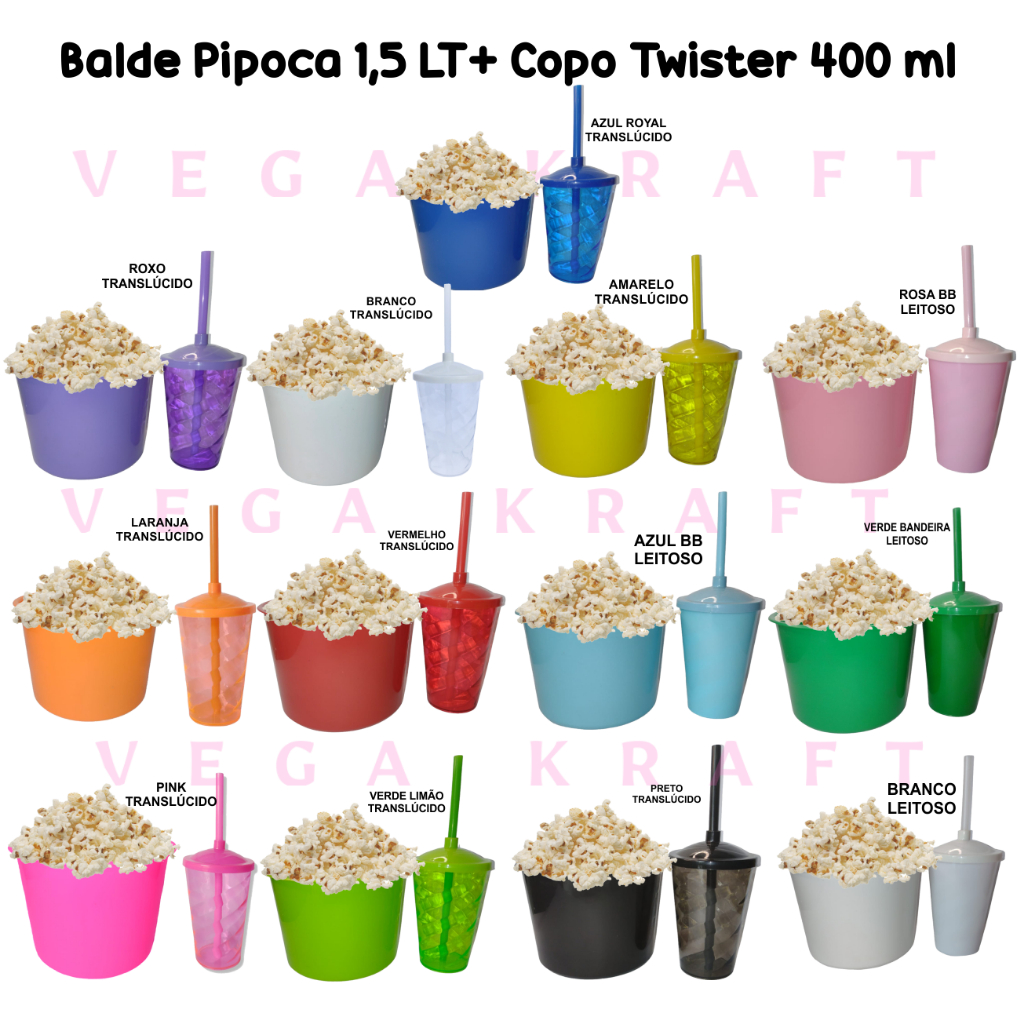 15 Kit Lembrancinha Balde Pipoca 1,5 LT + 15 Copos Twister 400 Ml Festa, Aniversário Transfer