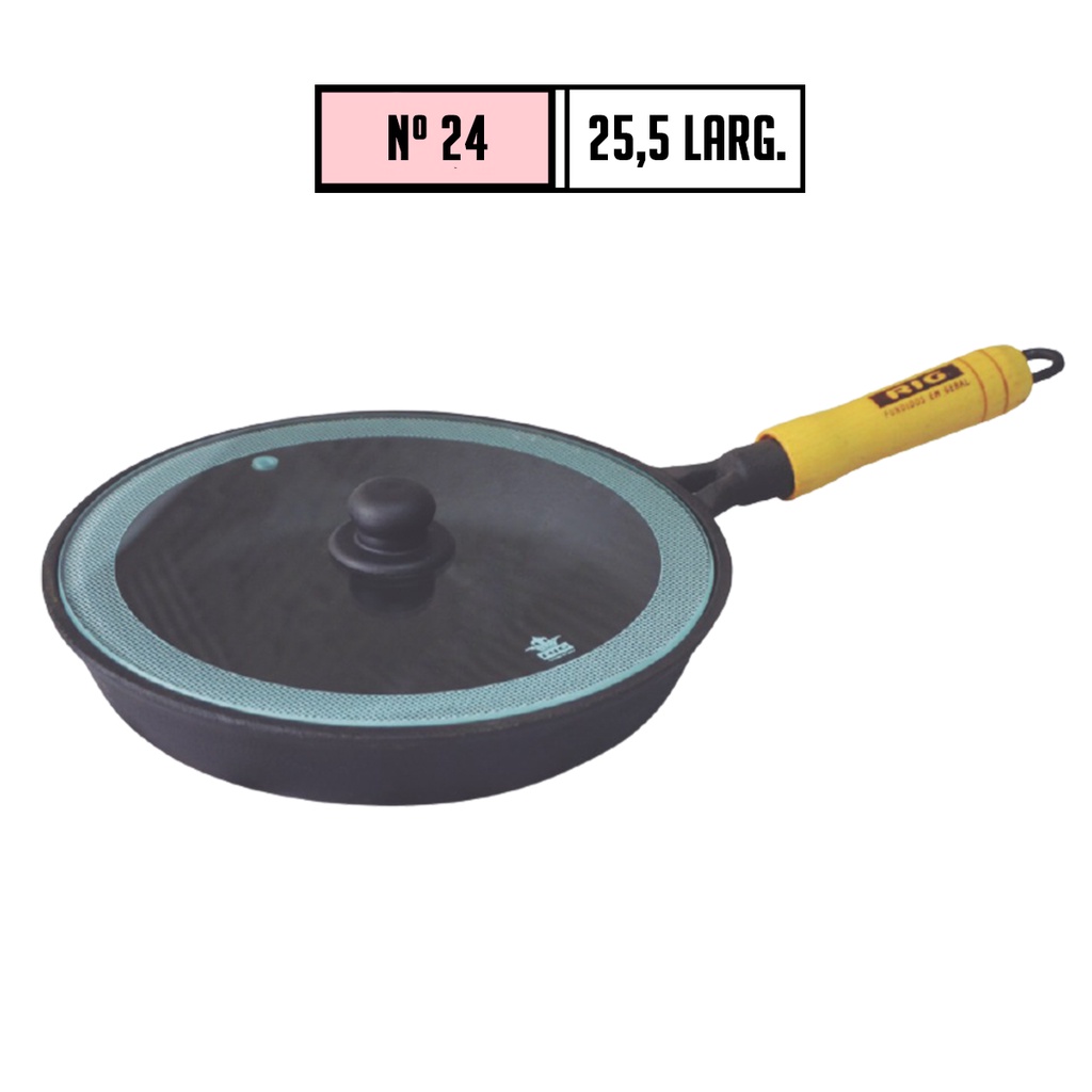 Frigideira Ferro Fundido Cabo Madeira Tampa De Vidro Tamanhos 20, 22 e 24