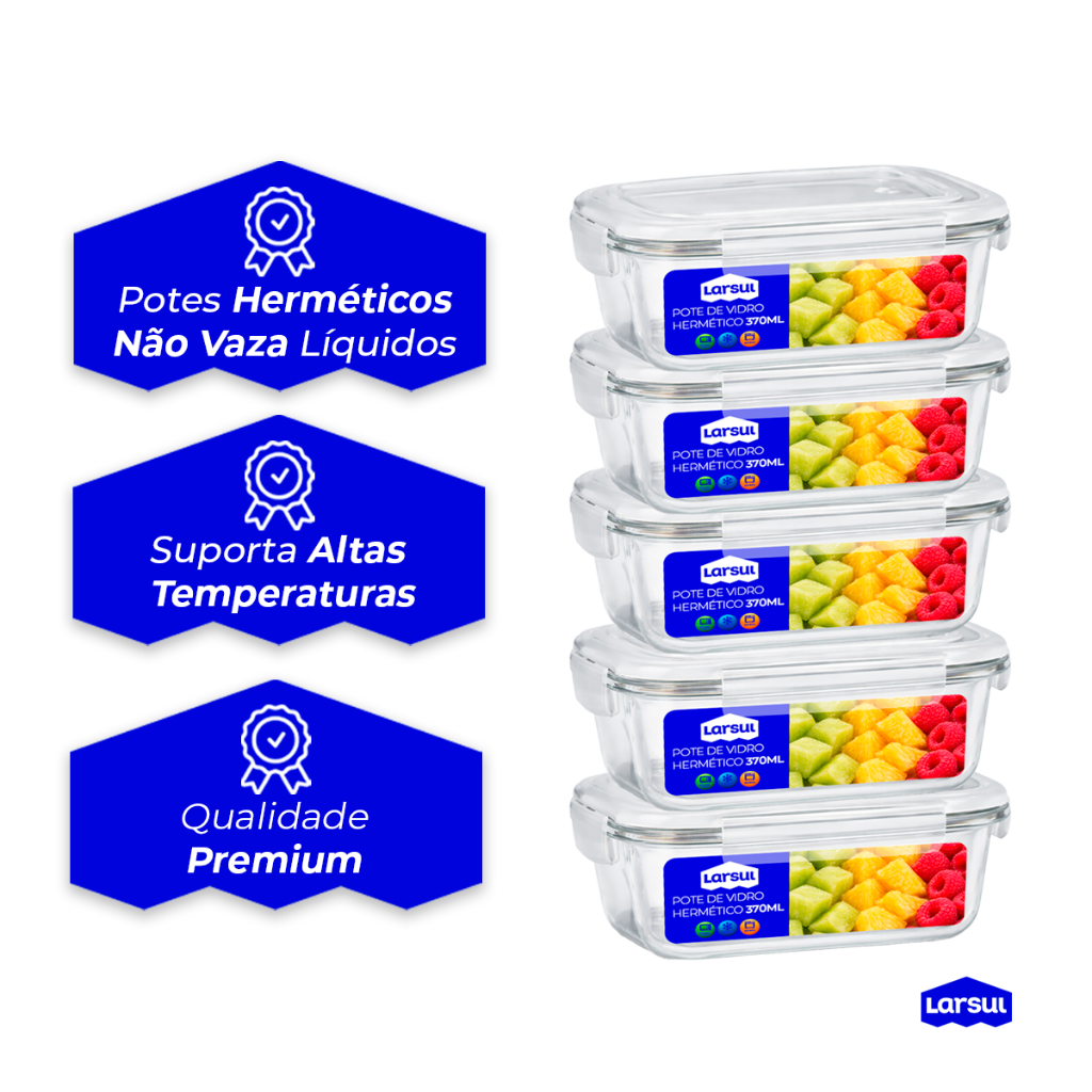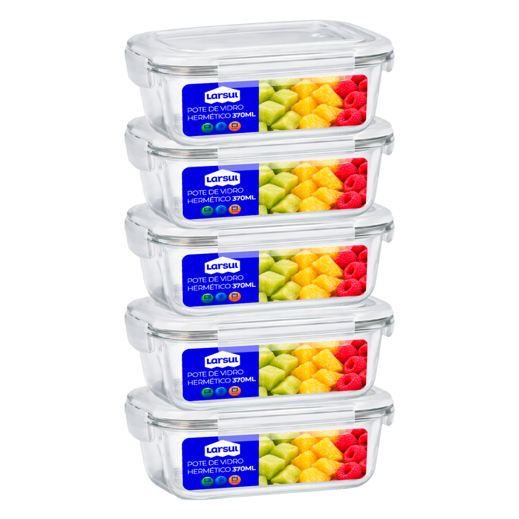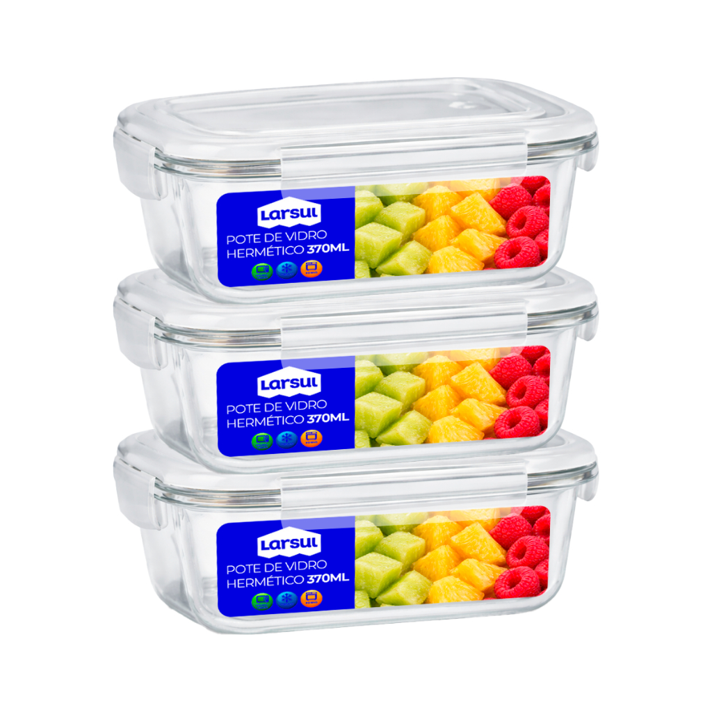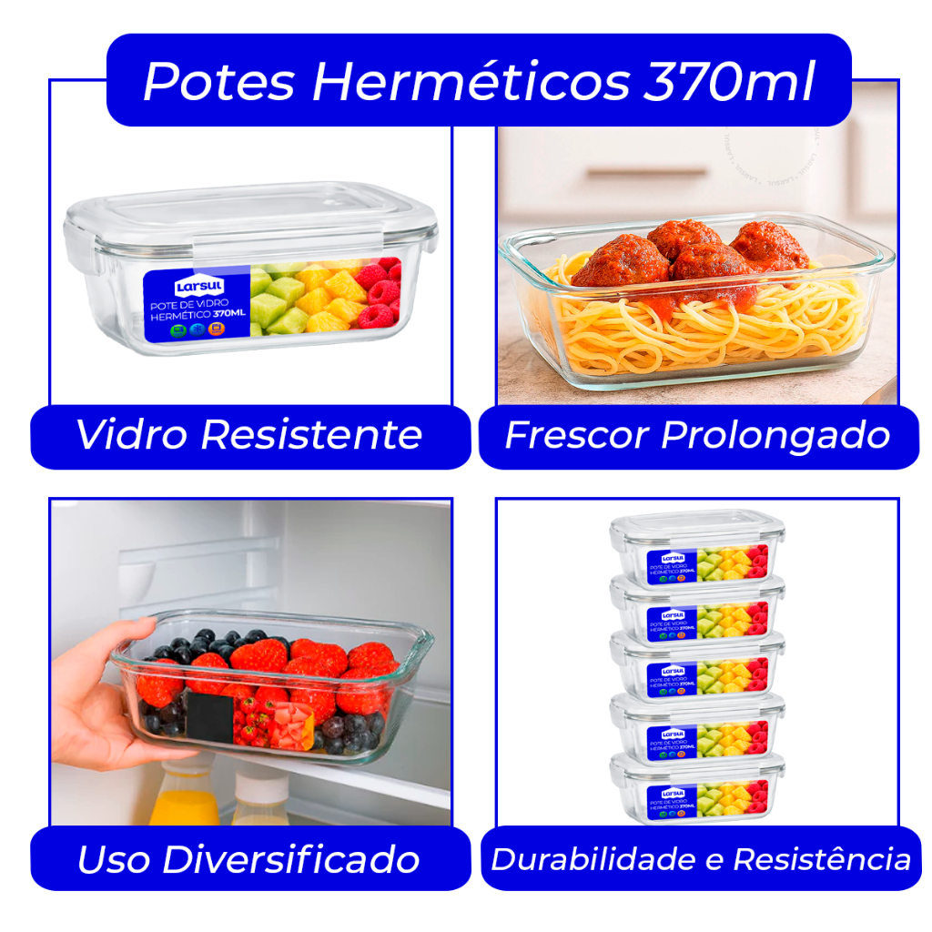 Conjunto de Potes de Vidros 370ml Hermeticos para Marmitas Fitness com 4 Travas Forno Micro Ondas