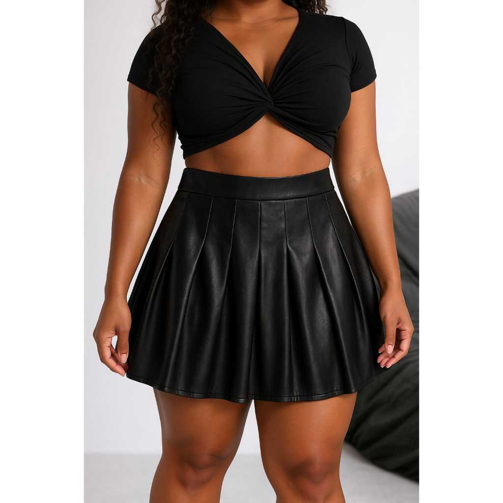 Saia Feminina Rodada Plissada Cintura Alta de couro Elegante