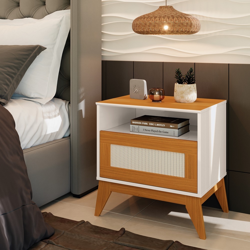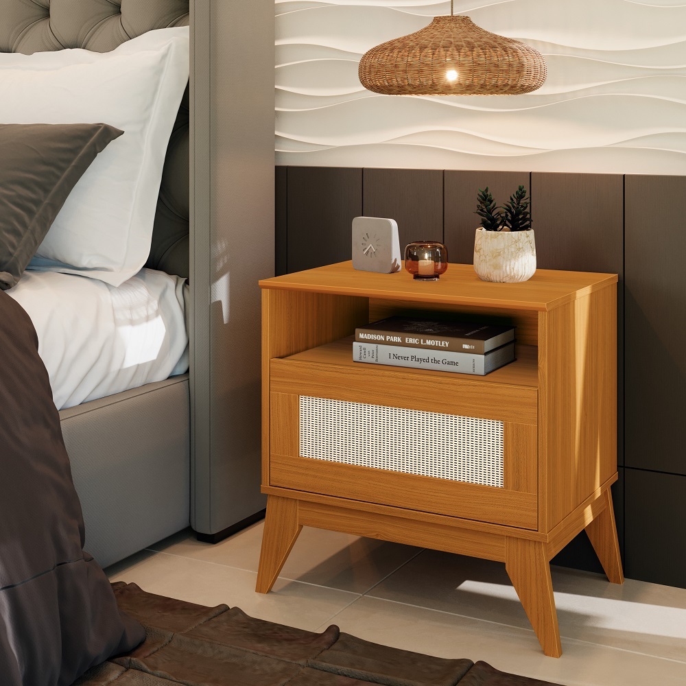 Mesa de Cabeceira Rattan pés e tampo em MDF 1 Gaveta Retrô
