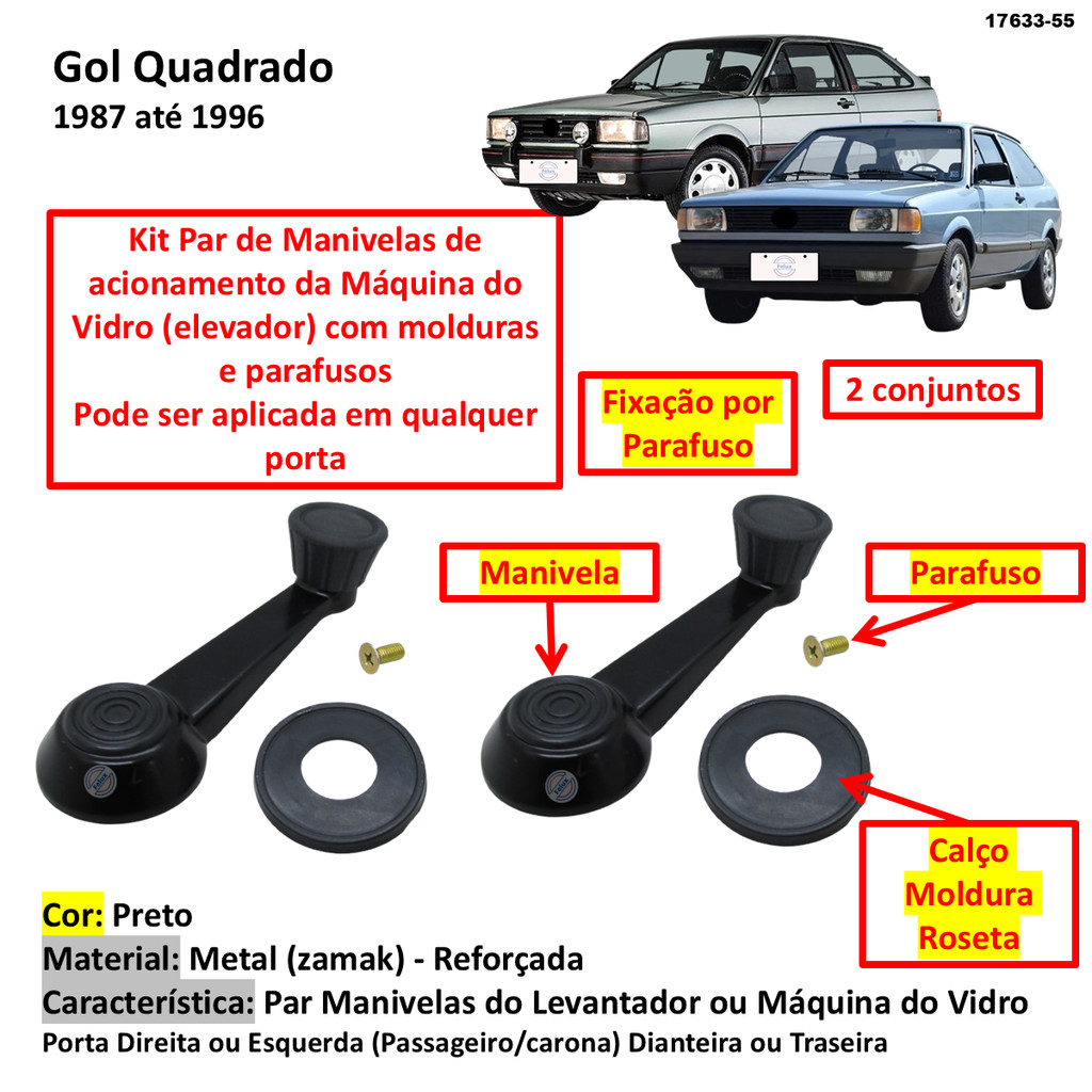 Par Manivelas do Vidro Completa Gol Quadrado preta Metal
