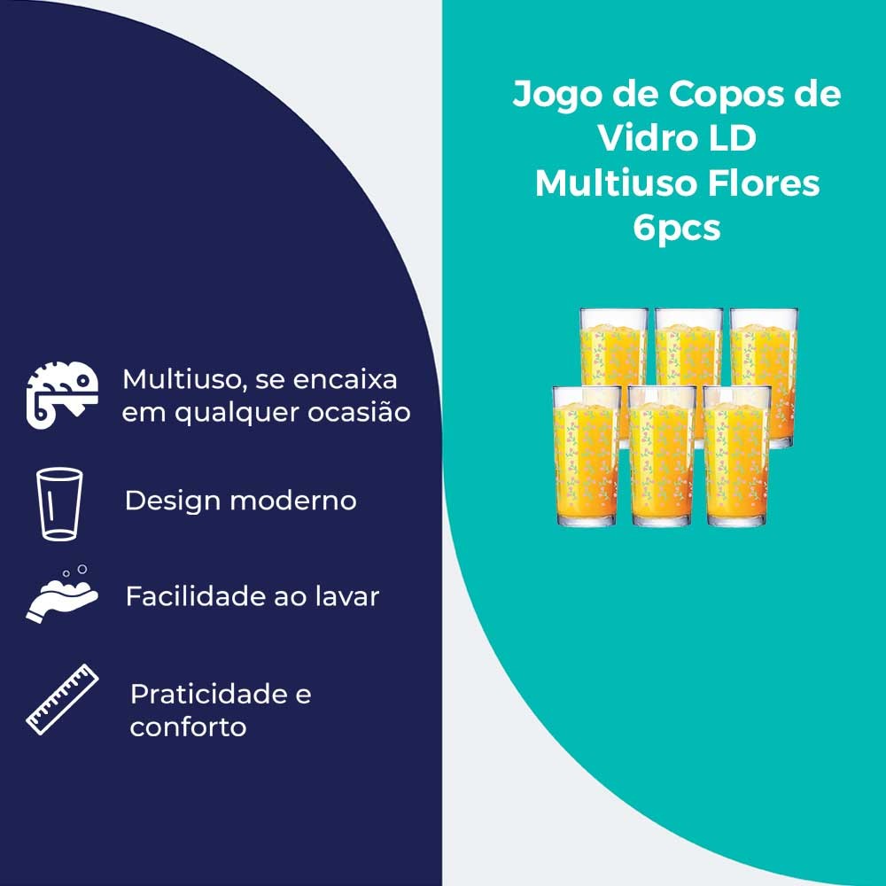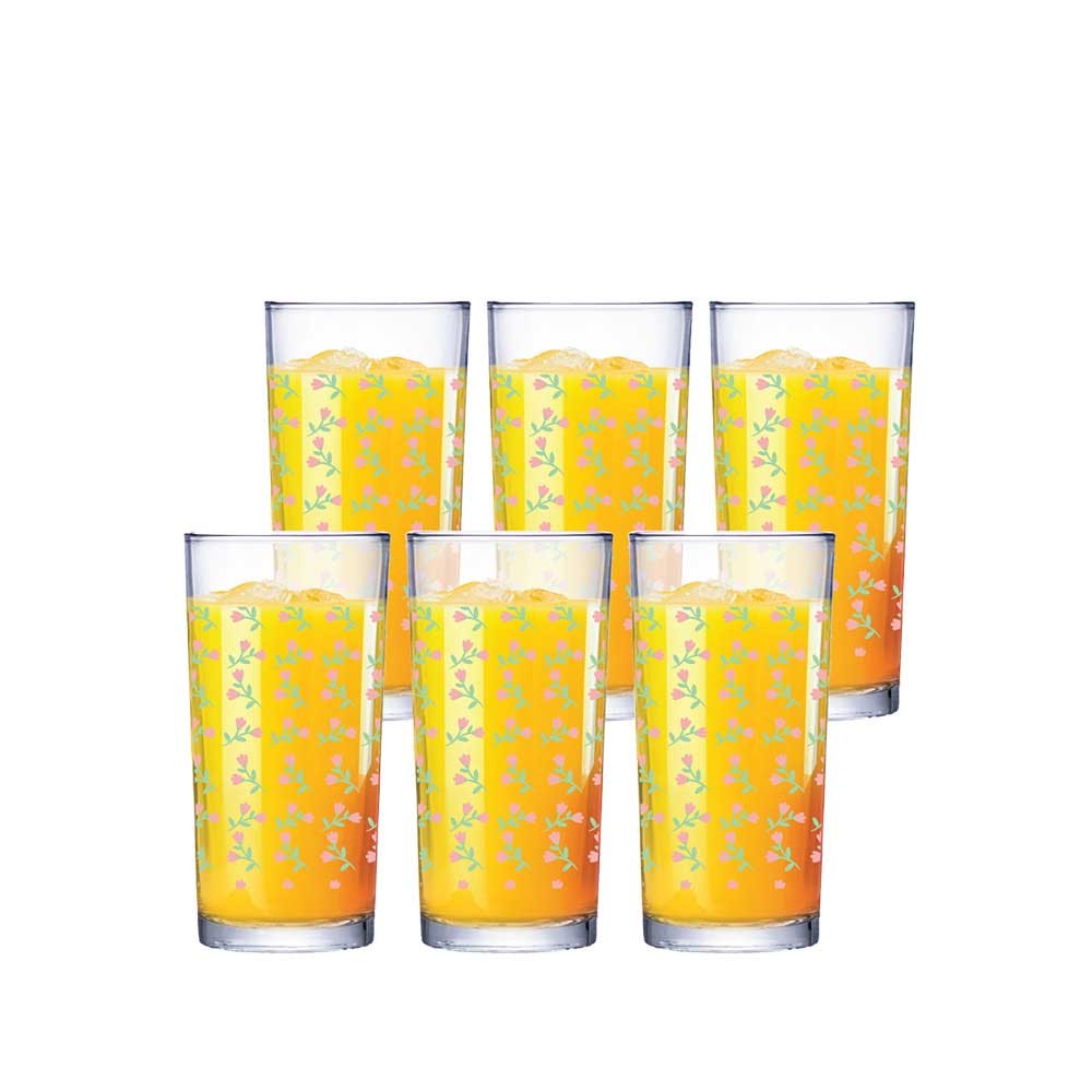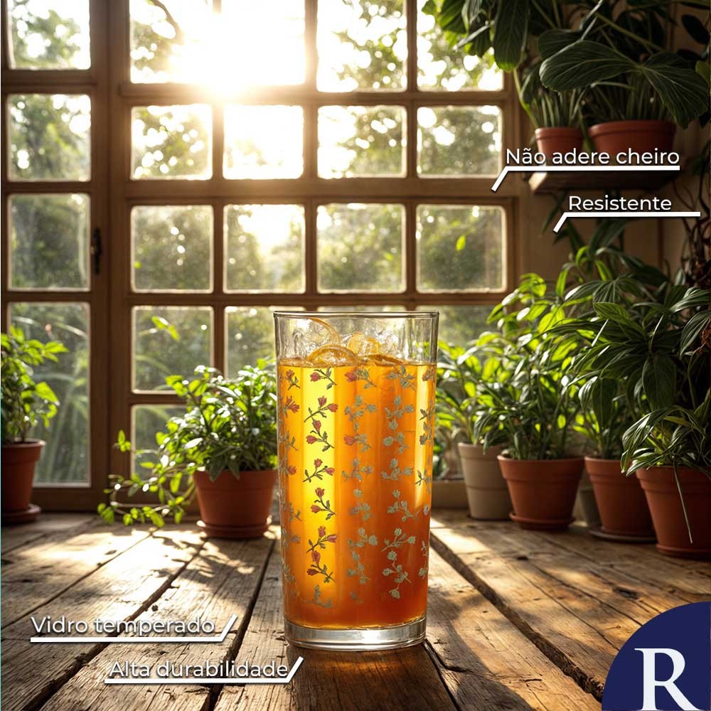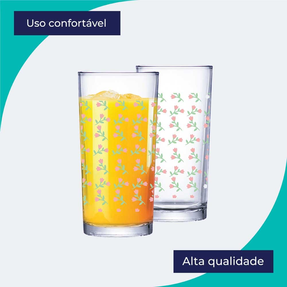 Jogo de Copos de Vidro Long Drink Flores 255ml 6 Peças Multiuso - Ruvolo